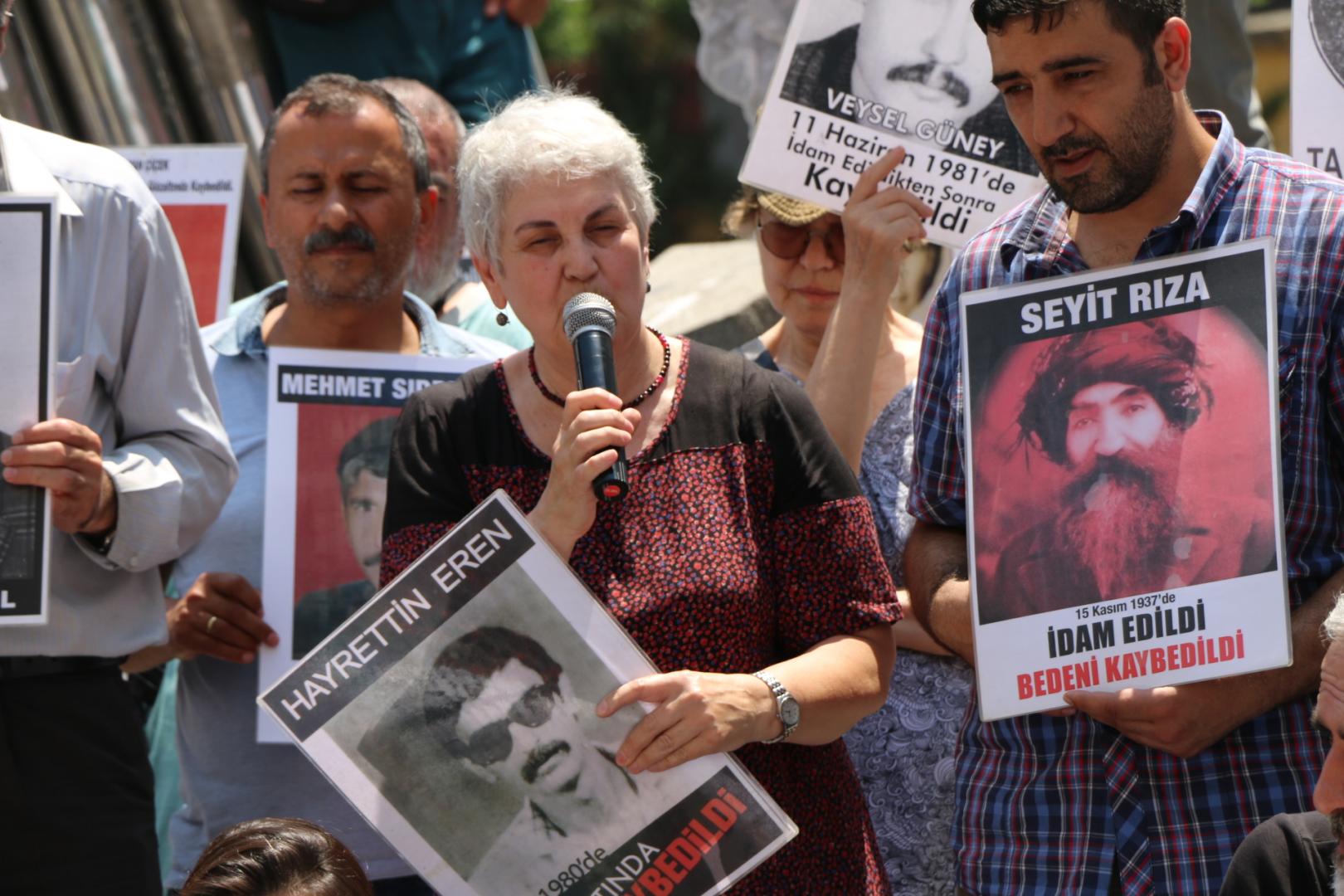 Eylemde ilk olarak İbrahim Demir’in kızı Deniz Demir konuştu. 24 yıldır kendi imkanları ve mücadeleleri ile buldukları mezarlarının tahrip edildiğini söyleyen Demir, “Kayıpların failleri mezarları tahrip edenlerdir. Onları kendi vicdanlarıyla baş başa bırakıyoruz. Aynı acıyı onların da yaşamasını istiyoruz” dedi.