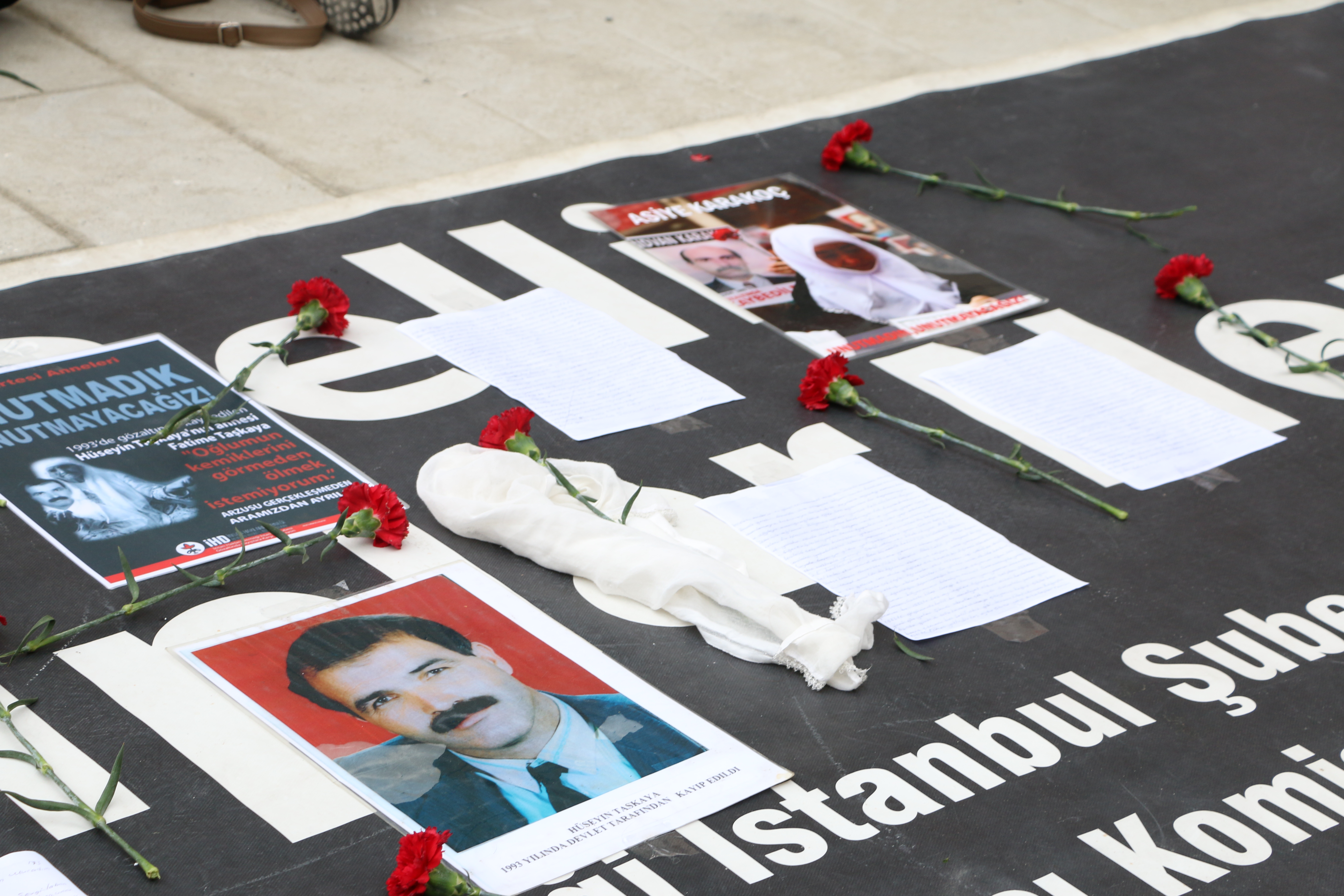 Eylemde açılan “Failler belli kayıplar nerede?” pankartının üzerine kayıpların resimleri, Hüseyin Taşkaya’nın cezaevinde çocuklarına yazdığı mektuplar ve kırmızı karanfiller konuldu.