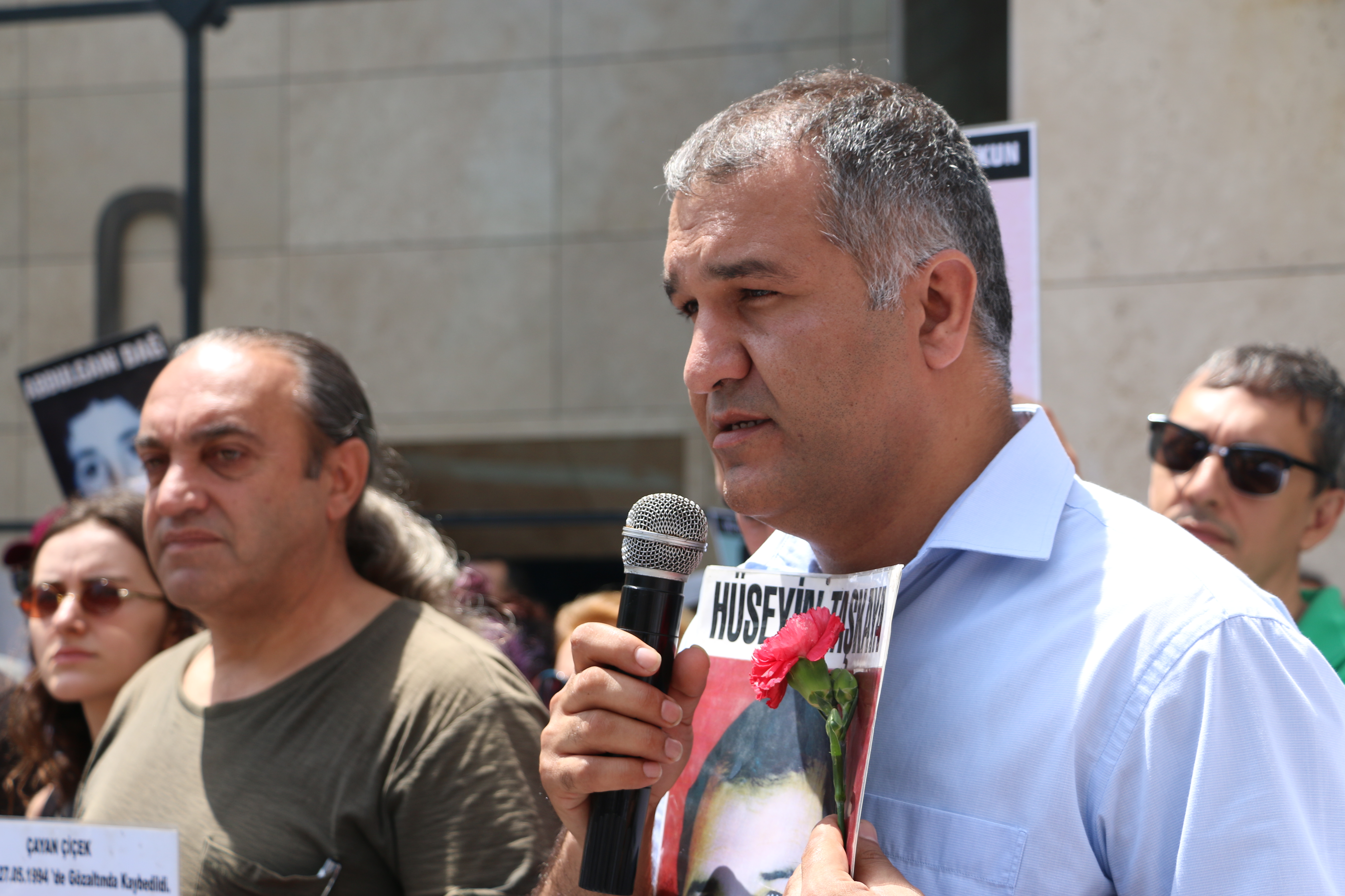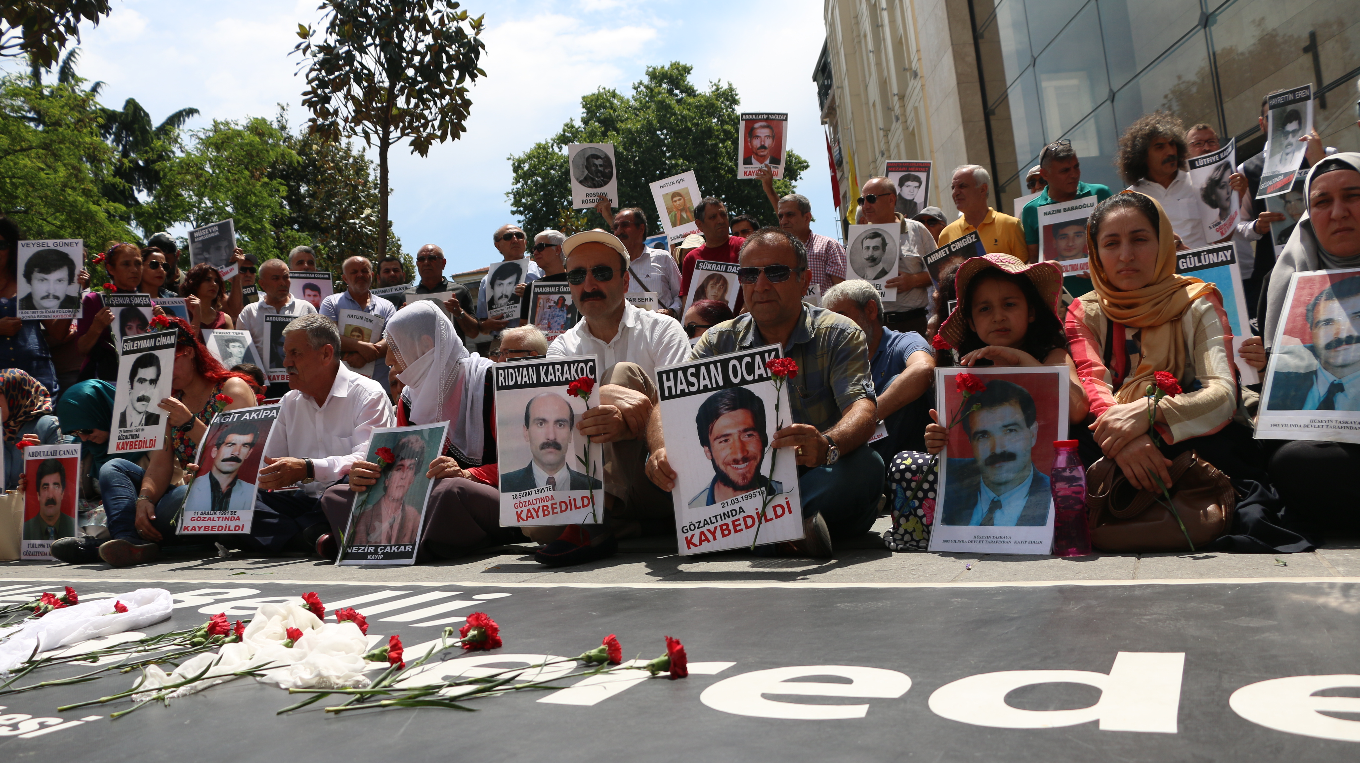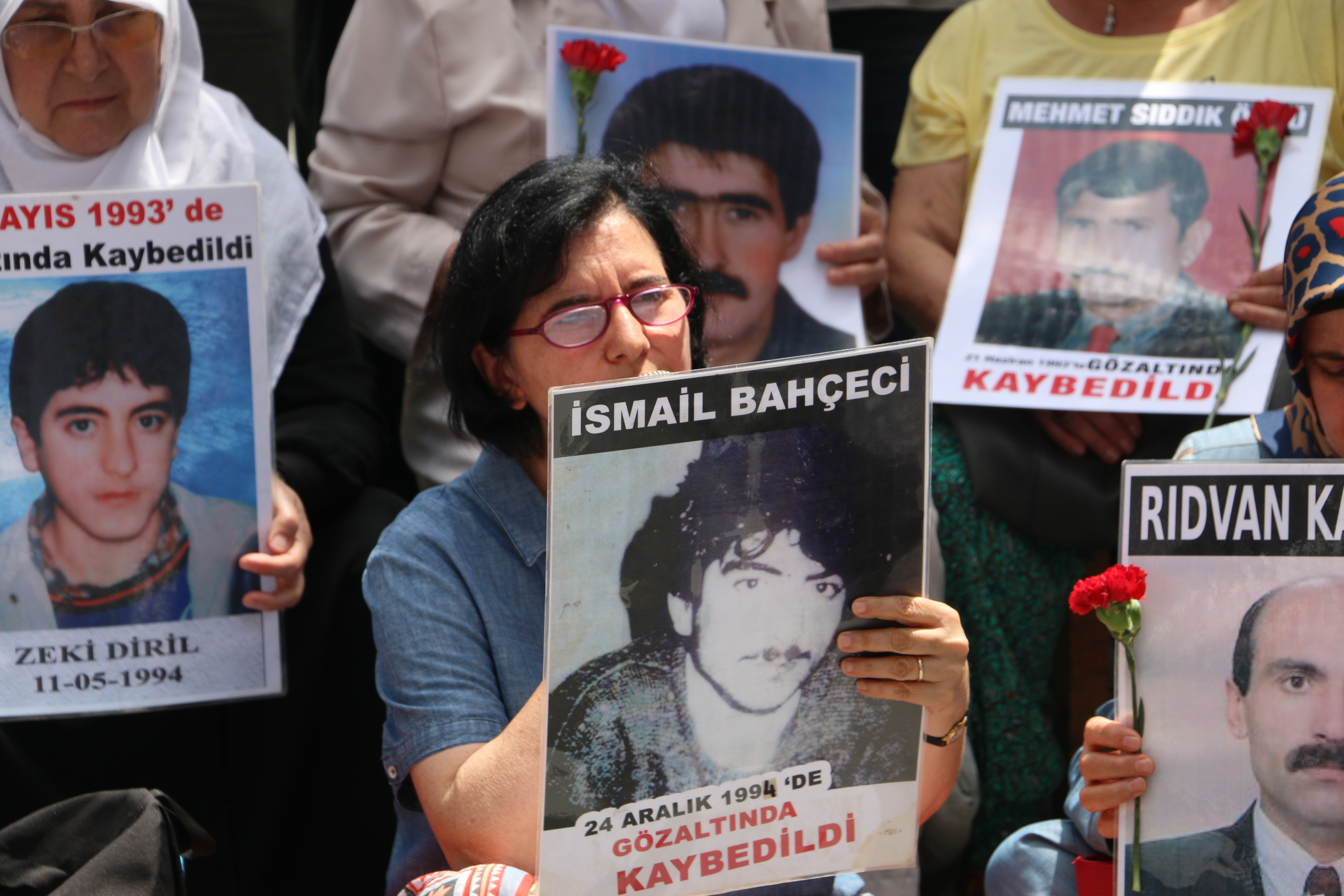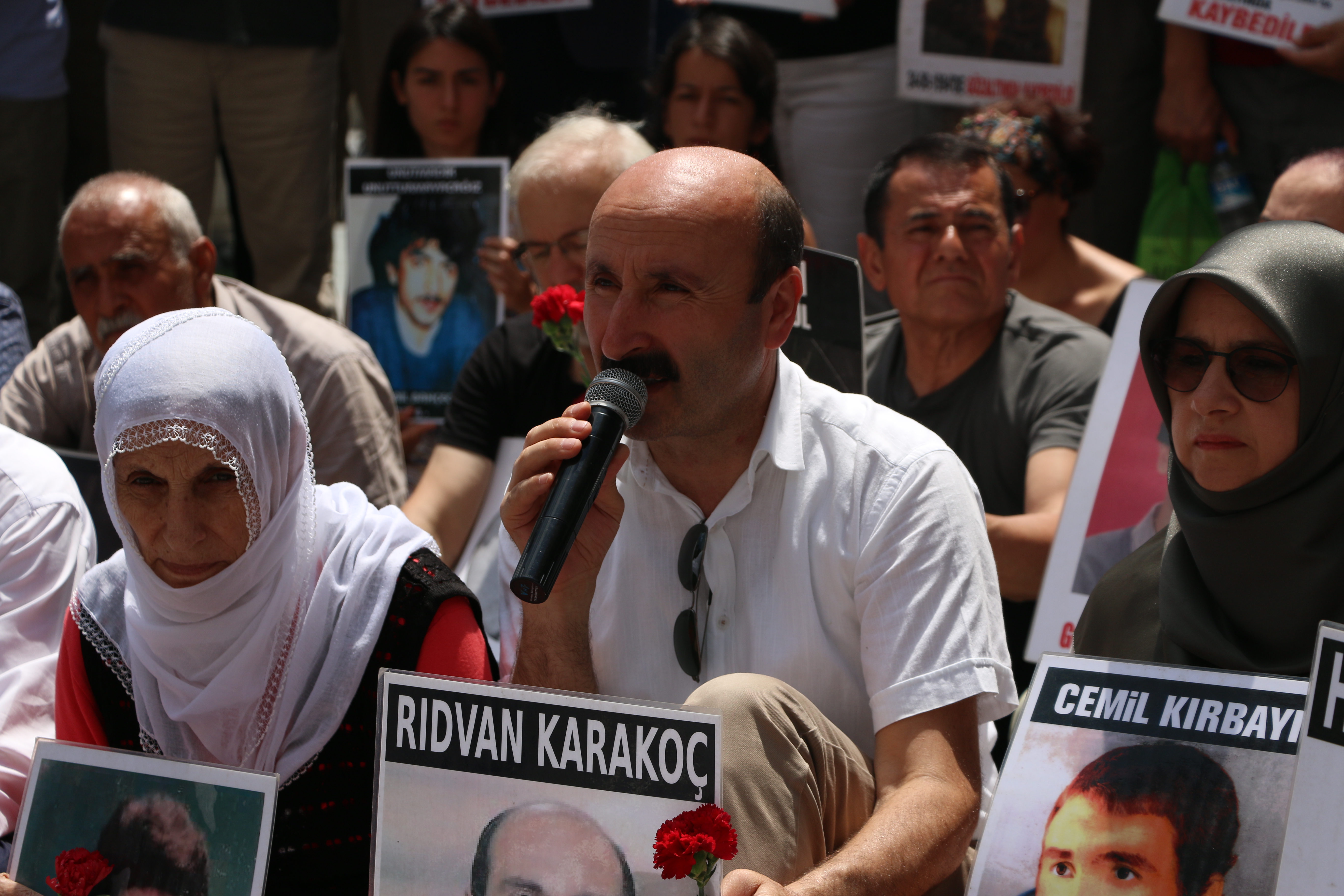 “Failler belli kayıplar nerede?” pankartının açıldığı eylemde pankartın üzerine kırmızı karanfiller ve barışı temsilen beyaz tülbentler serildi. Kayıpların fotoğraflarının taşındığı eylemde ilk sözü gözaltında kaybedilen Rıdvan Karakoç’un kardeşi Hasan Karakoç aldı.