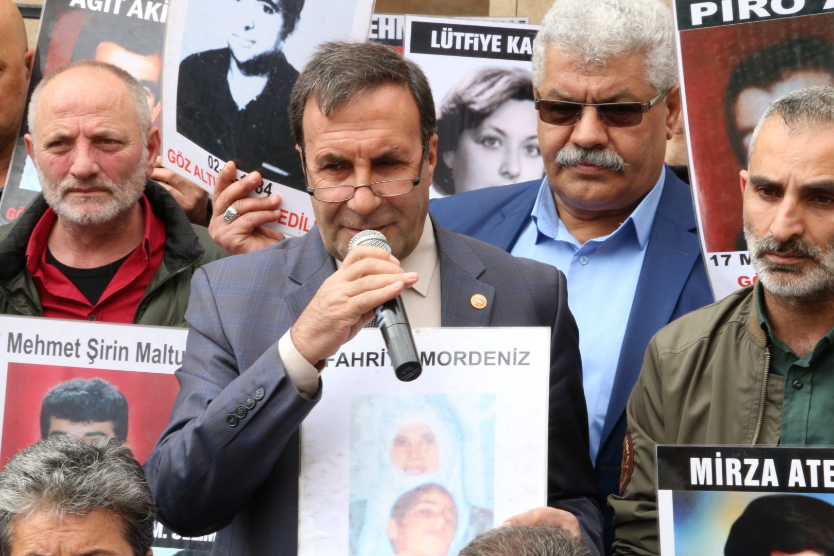 Eylemde ilk konuşmayı HDP Iğdır Milletvekili Mehmet Emin Adıyaman konuştu. Faili belli kaybetmeler karşısında annelerin 680 haftadır süren mücadelesini selamlayarak sözlerine başlayan Adıyaman, geçmişten bugüne karanlık güçlerin hep var olduğunu ve etkili bir soruşturma ya da yargılama olmadığını söyledi. AKP’nin de bu sorun karşısında sağır ve dilsizi oynadığına değinen Adıyaman, ayrıca mecliste kayıplarla ilgili verilen önergelerin de AKP tarafından reddedildiğinin altını çizdi.