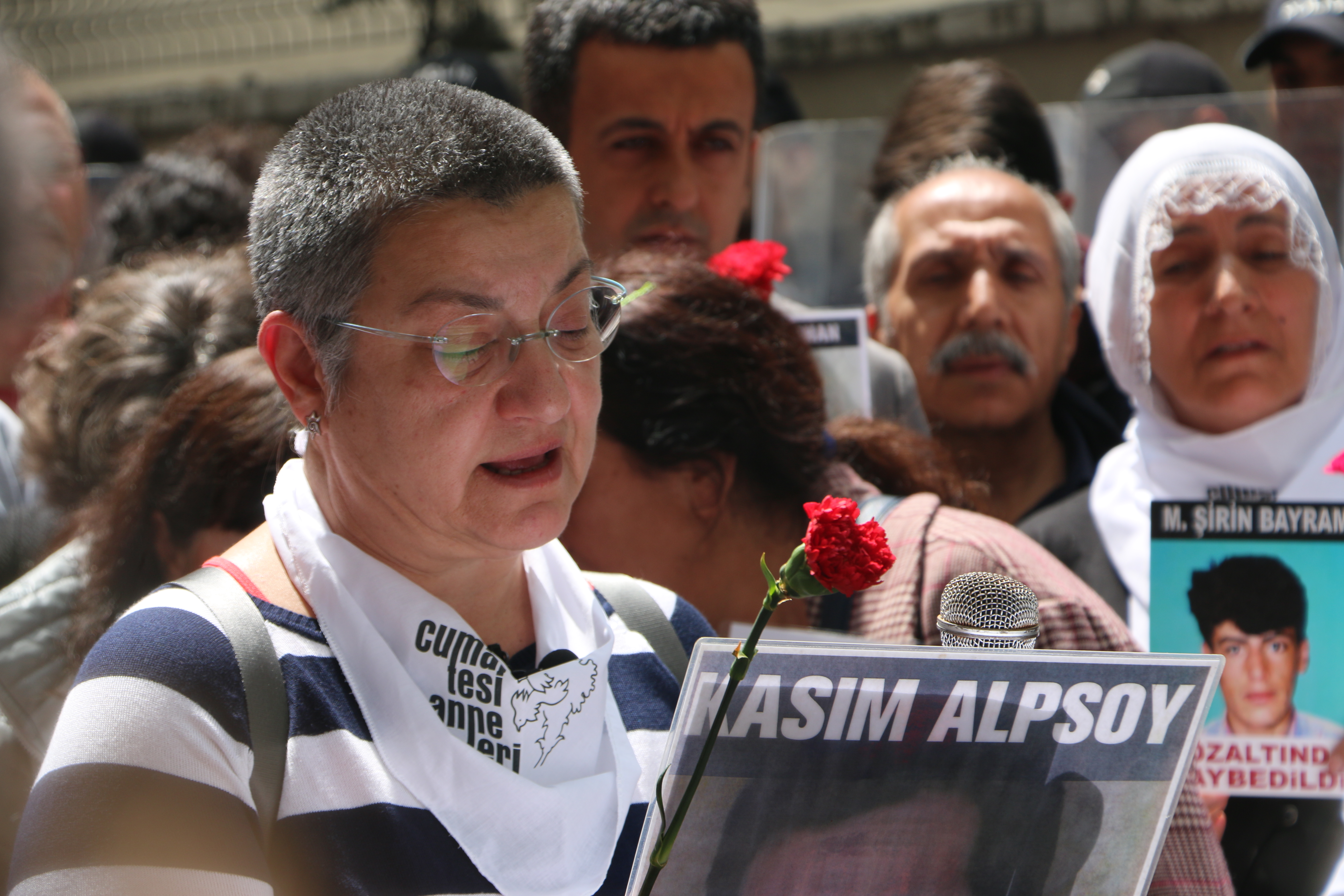 Kasım Alpsoy’un eşi Leyla Erdoğan Alpsoy, 25 yıl önce eşinin gözaltına alınarak ağır işkence gördüğünü ve sabah eve geldiğini, kimliğini almak için tekrar karakola gittiğini ve kendisinden bir daha haber alamadıklarını dile getirdi. Eşinden haber alana kadar burada mücadelesini sürdüreceğini bildiren Alpsoy, “Bize Galatasaray’ı yasakladılar. Galatasaray’ı bize açıncaya kadar mücadelemize devam edeceğiz” dedi.