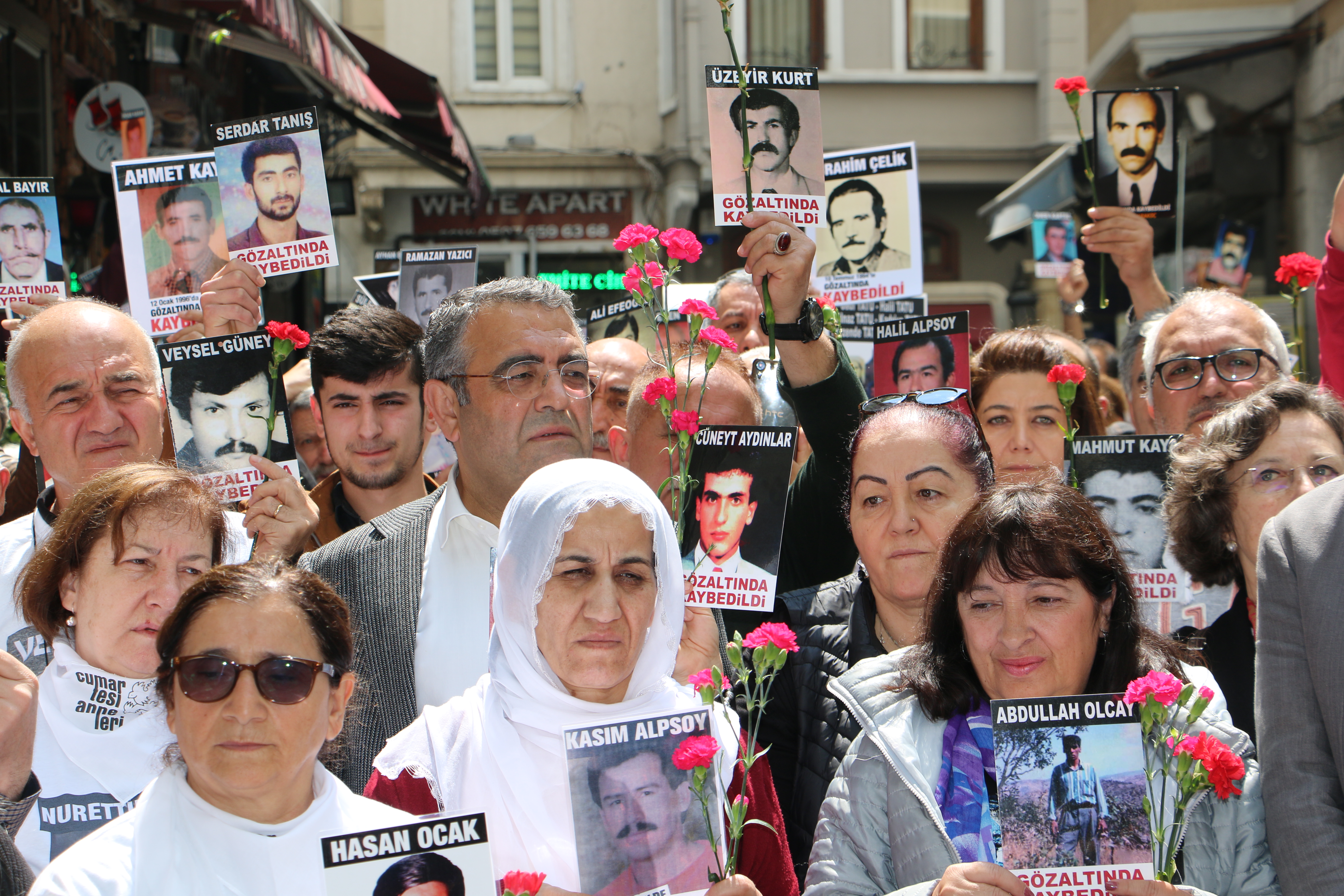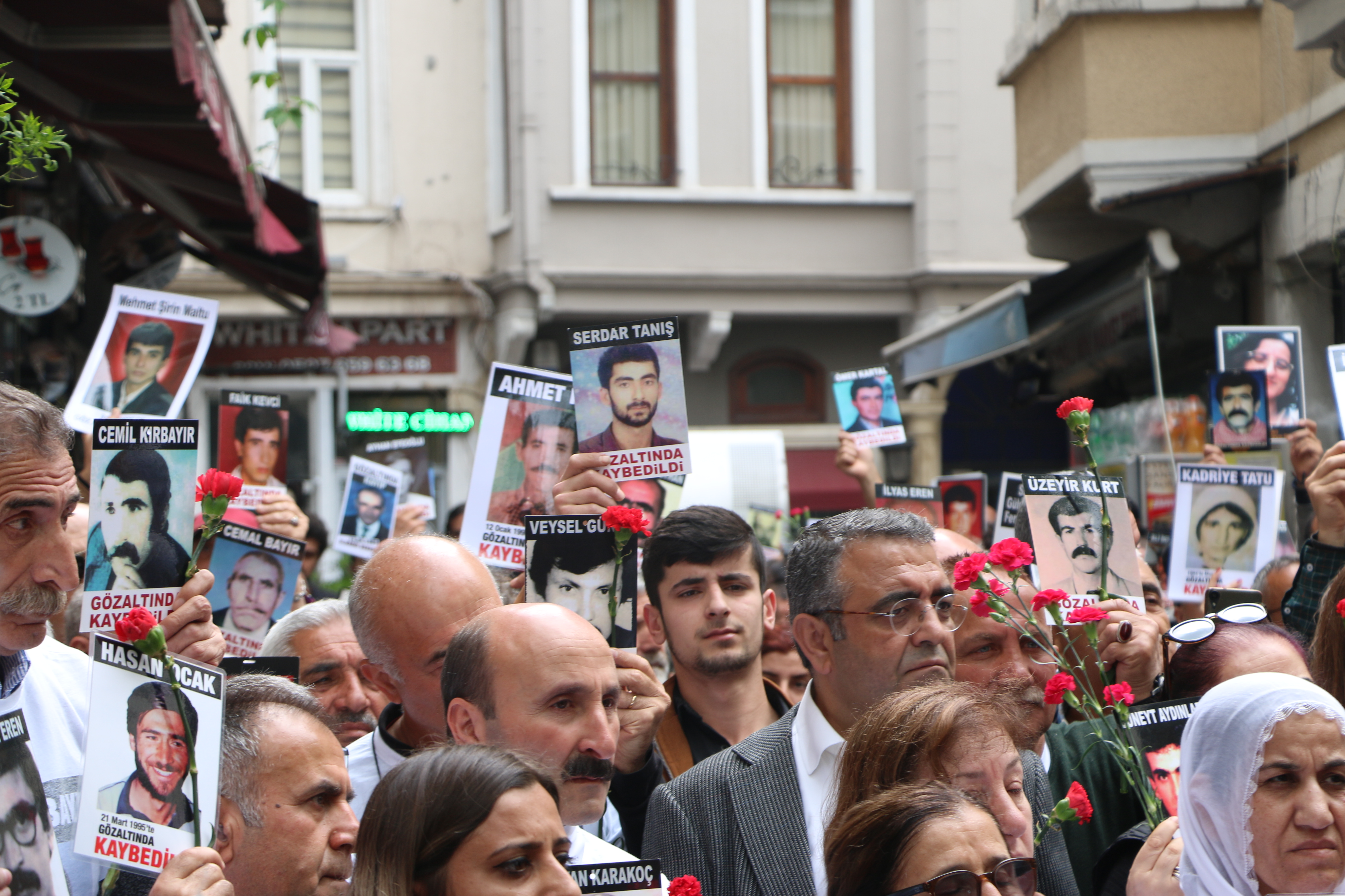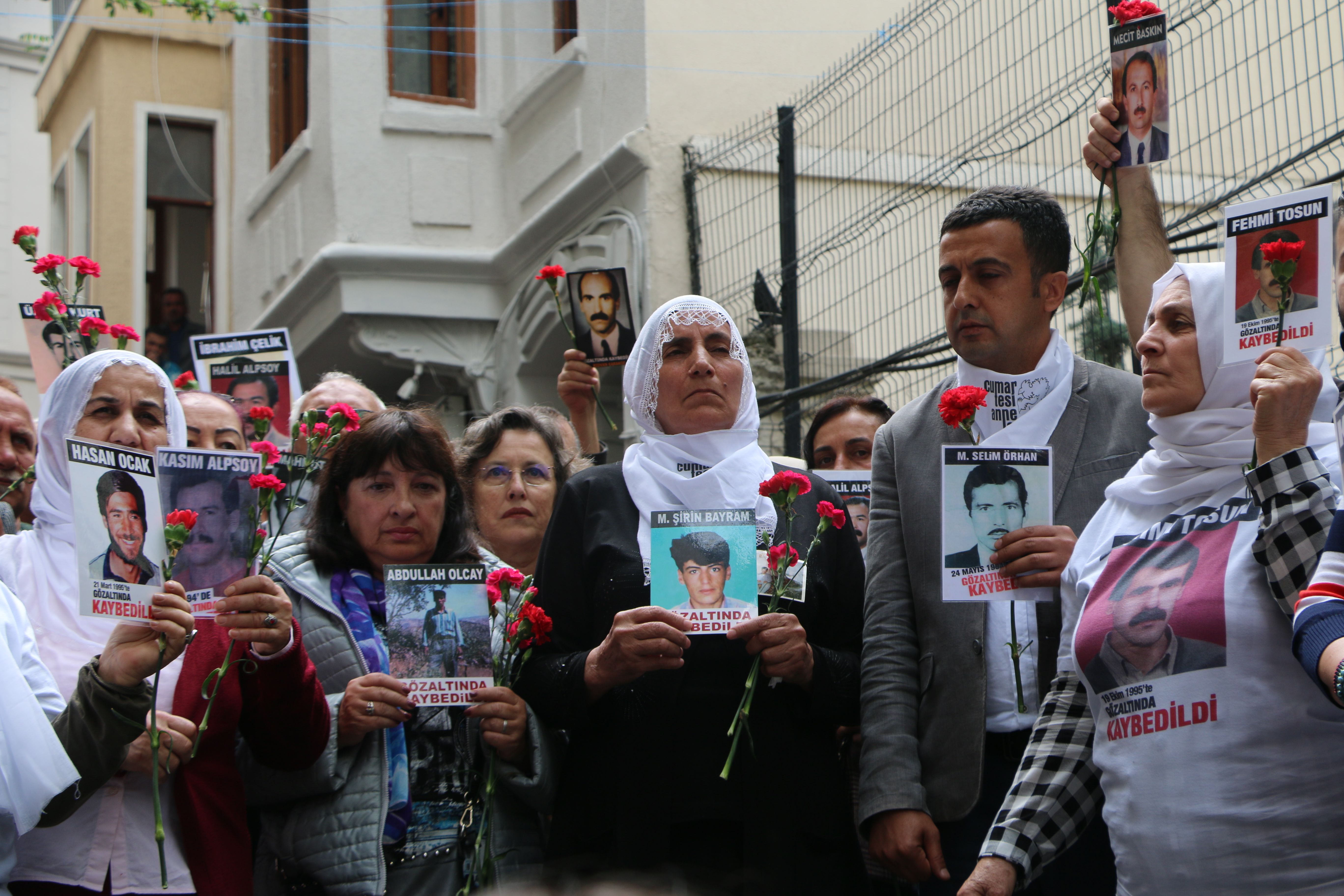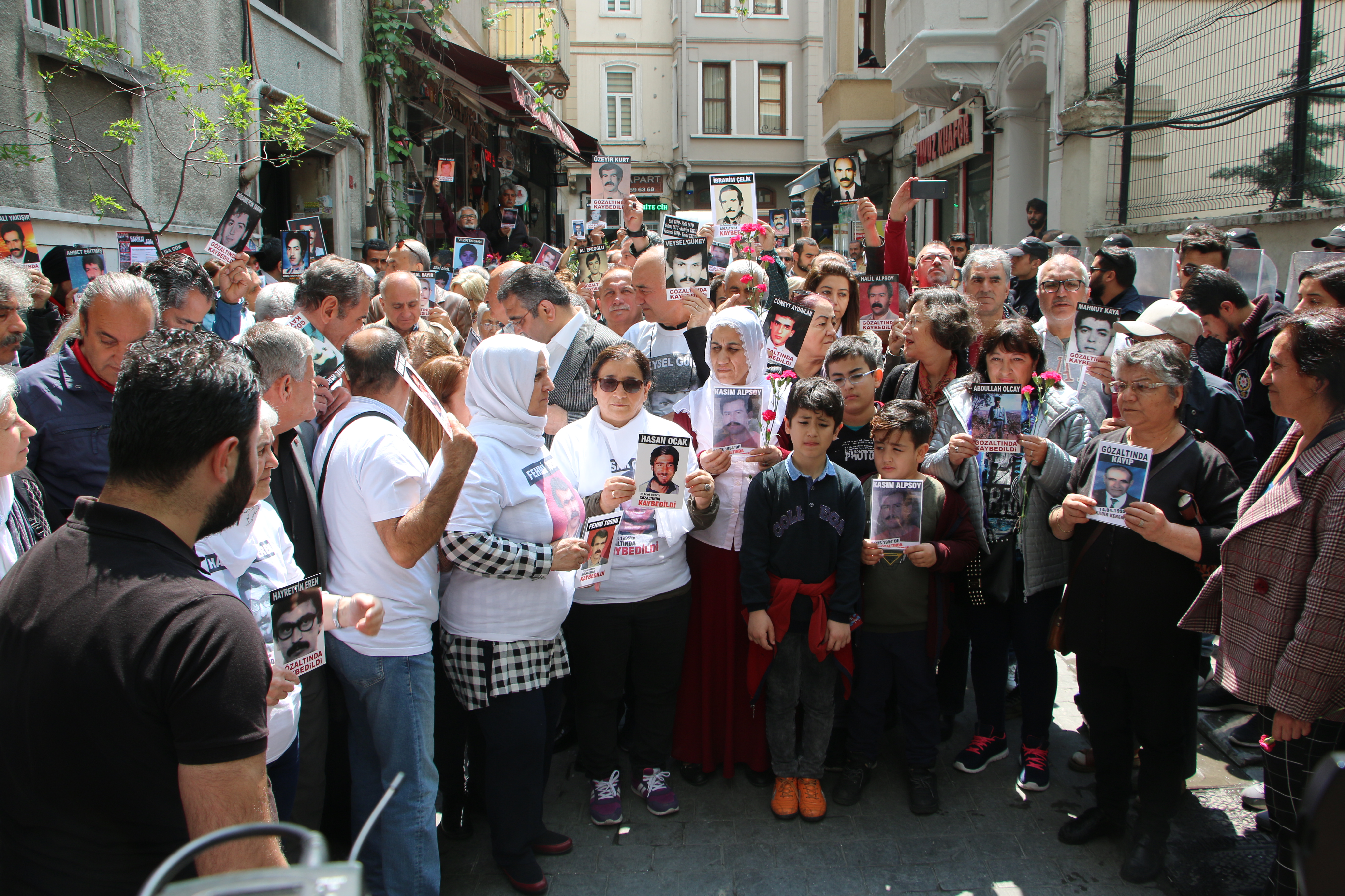 Galatasaray Meydanı’nın yasaklanması nedeniyle İnsan Hakları Derneği (İHD) İstanbul Şubesi önünde bir araya gelen insan hakları savunucuları, gözaltında kaybedilen yakınlarının fotoğraflarının bulunduğu dövizler de taşıdı.