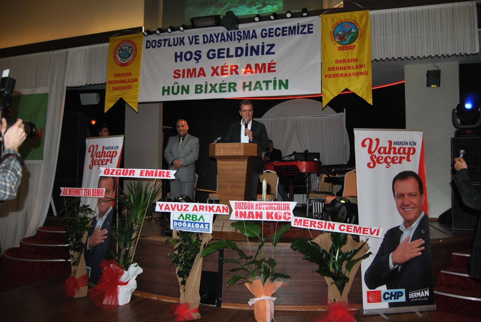 Mersin Dersimliler Derneği dayanışma yemeği düzenledi. Geceye Alevi Bektaşi İnanç Kurulu ve Mersin Cemevi Başkanı Hasan Kılavuz, Merter Sanayici ve İş Adamları Derneği (Mesiad) Başkanı Hasan Engin, Mersin Baro Başkanı Bilgin Yeşilboğaz, Eğitim-Sen Mersin Şube Başkanı Sinan Muşlu ve CHP Mersin Büyükşehir Belediye Başkanı Adayı Vahap Seçer ile çok sayıda yurttaş katıldı.
