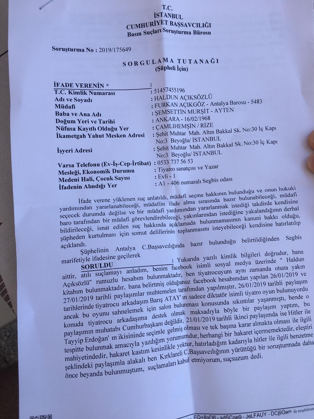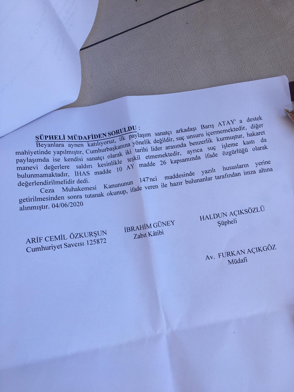Açıksözlü, Kırklareli Cumhuriyet Başsavcılığının yürüttüğü soruşturma kapsamında SEGBİS aracılığıyla ifade verdi. Açıksözlü’ye sosyal medya hesabında yapılan paylaşımlar soruldu. Açıksözlü, paylaşımların kendisine ait olduğunu ve tiyatro sanatçısı Barış Atay’a destek olmak amacı taşıdığını belirterek, düşüncelerini ifade ettiğini ve bunun da suç olmayacağı cevabını verdi.