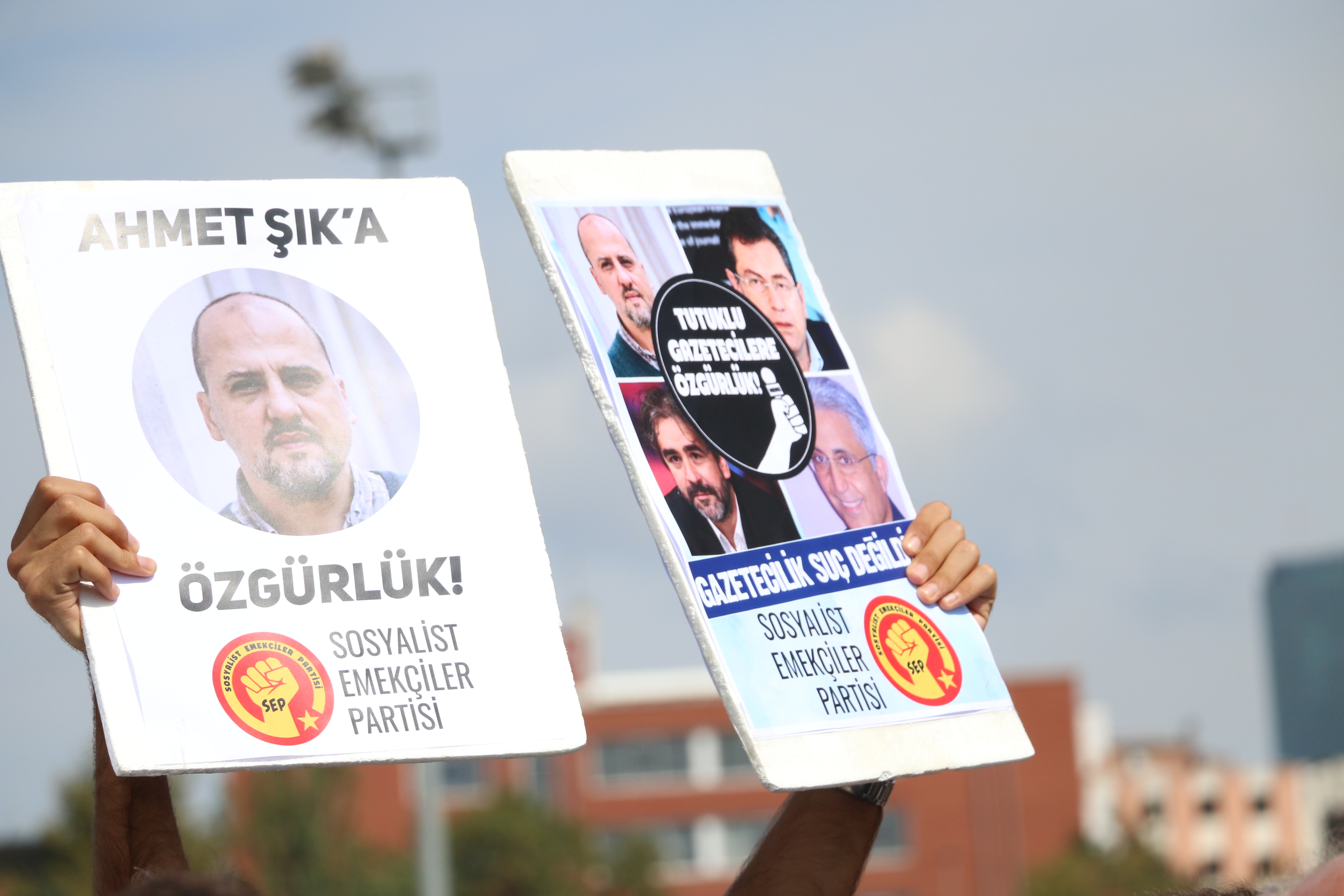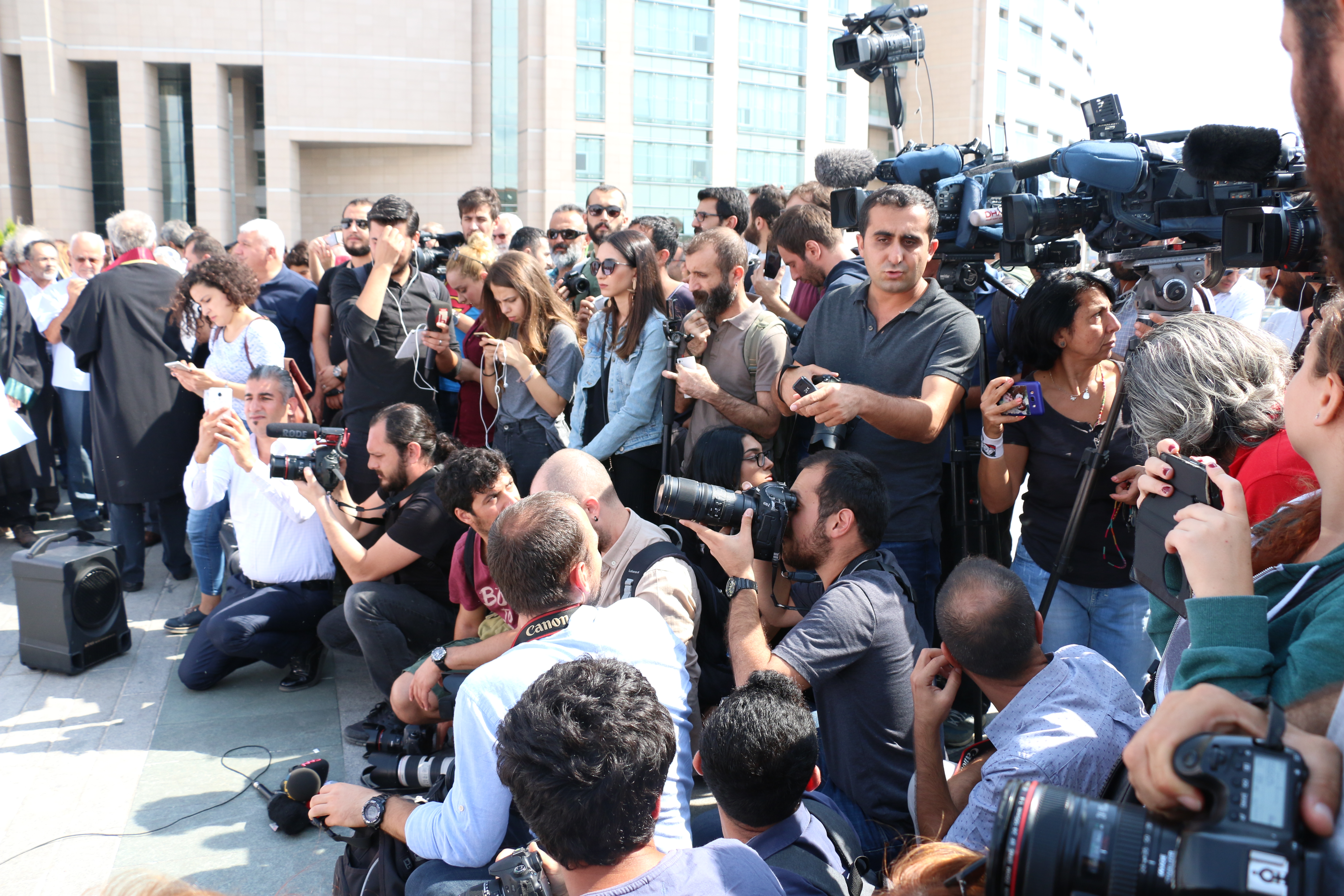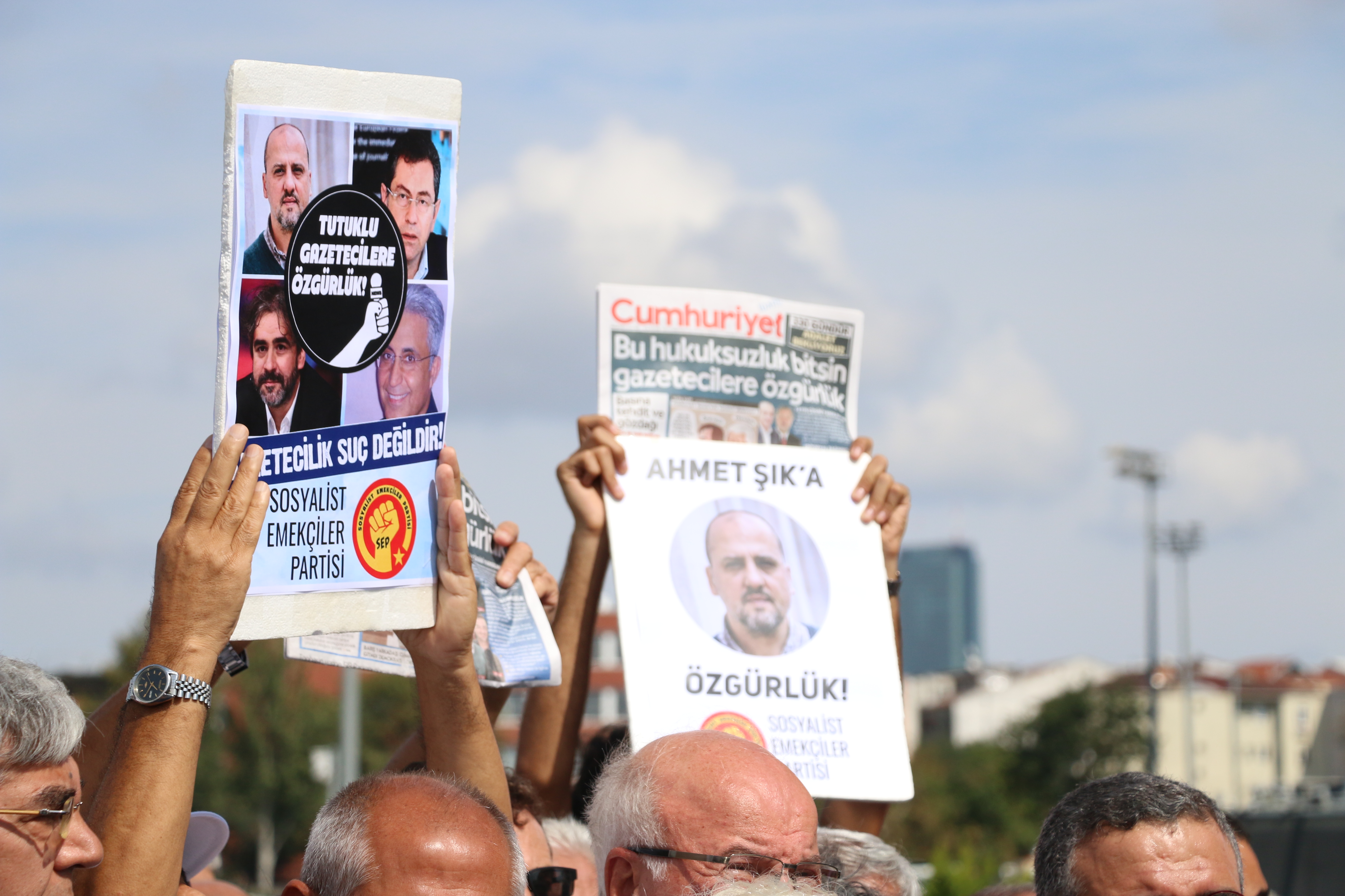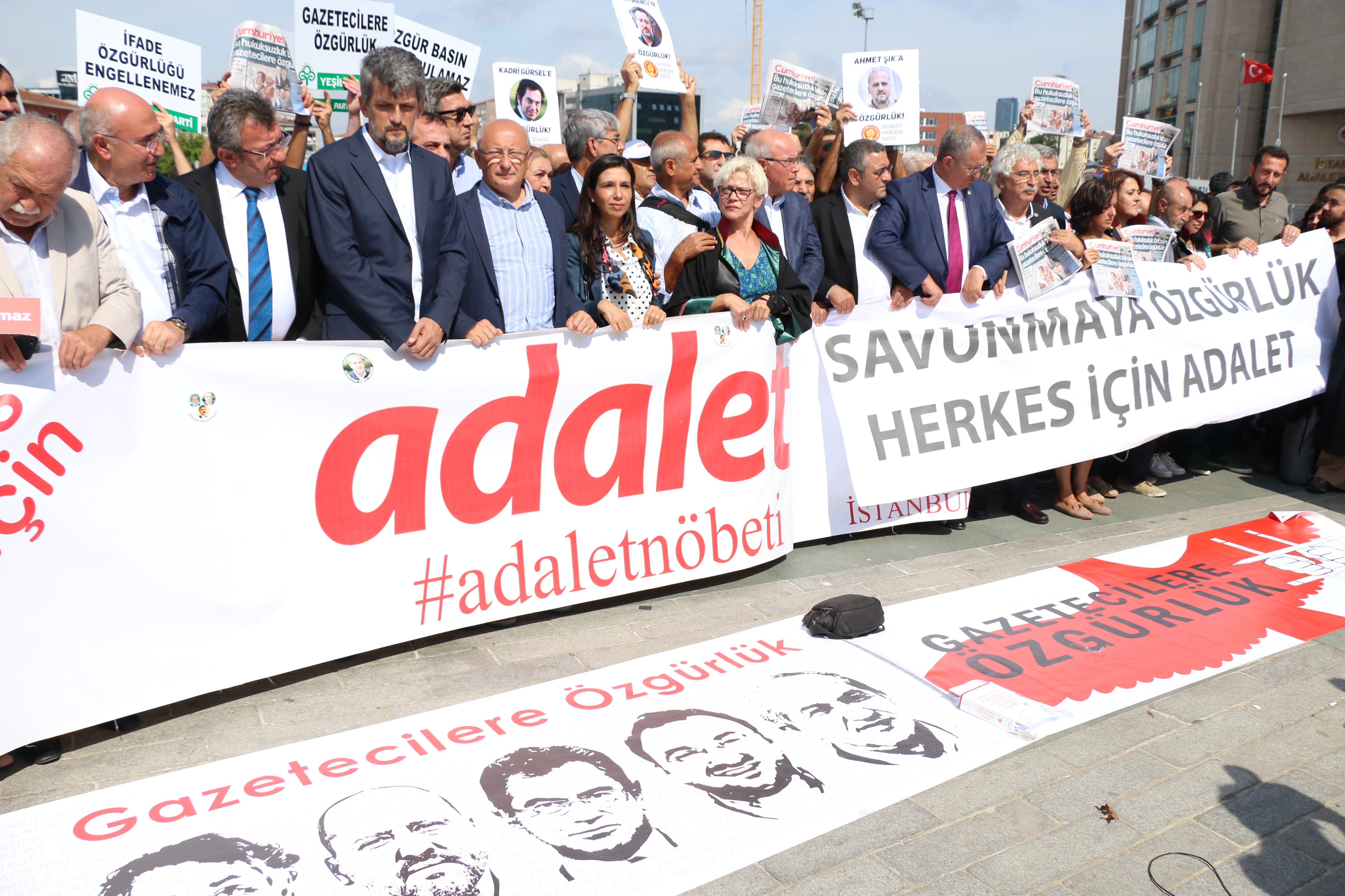 “Herkes için adalet”, “Savunmaya özgürlük herkes için adalet” ve üzerinde tutuklu gazeteciler Ahmet Şık, Kadri Gürsel, Emre İper, Akın Atalay, Murat Sabuncu’nun fotoğraflarının bulunduğu “Gazetecilere özgürlük” yazılı pankartların açıldığı basın açıklamasında “Cumhuriyet susmaz”, “Gazetecilik suç değildir”, “Özgür basın susturulamaz”, “İfade özgürlüğü engellenemez” dövizleri taşındı.
