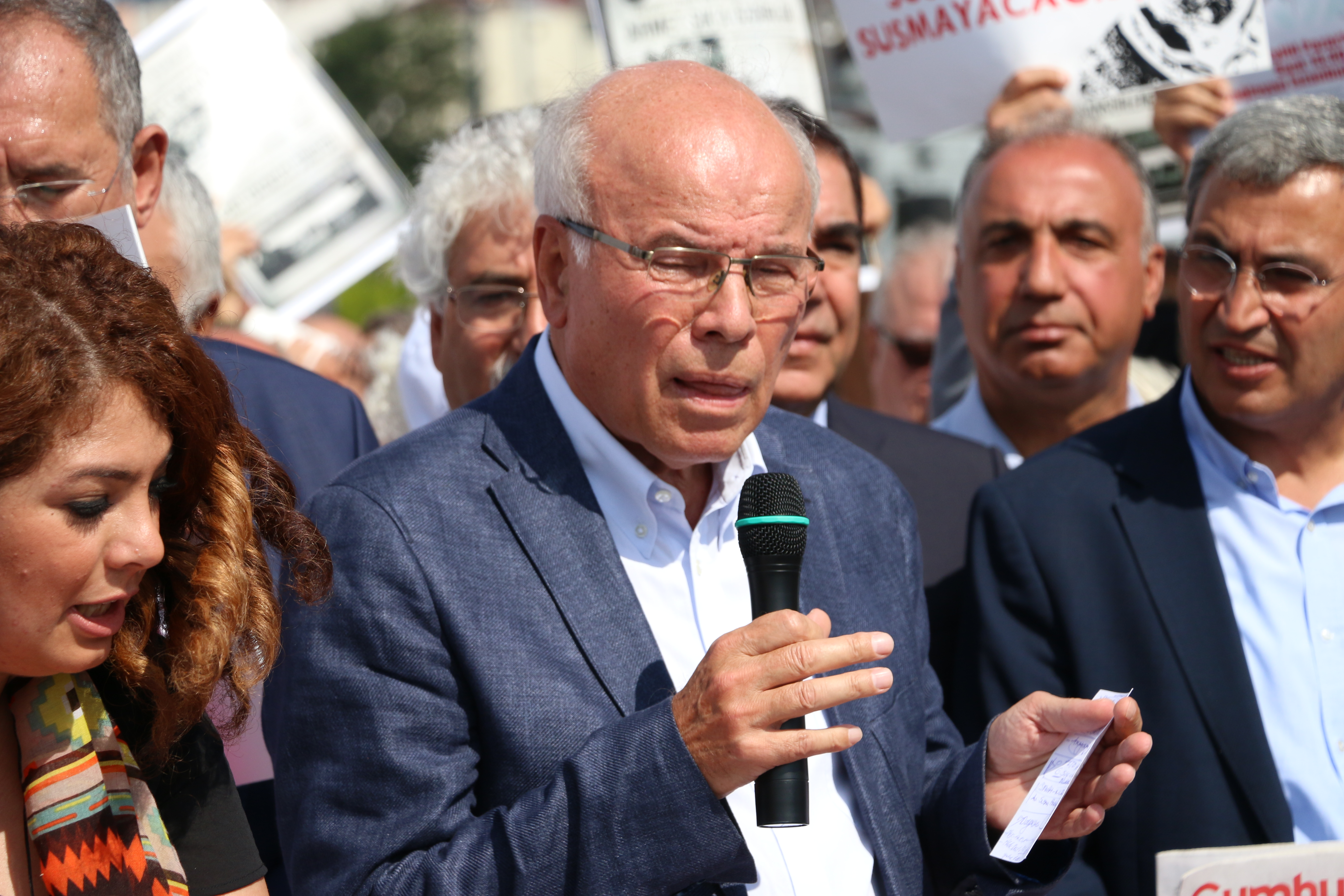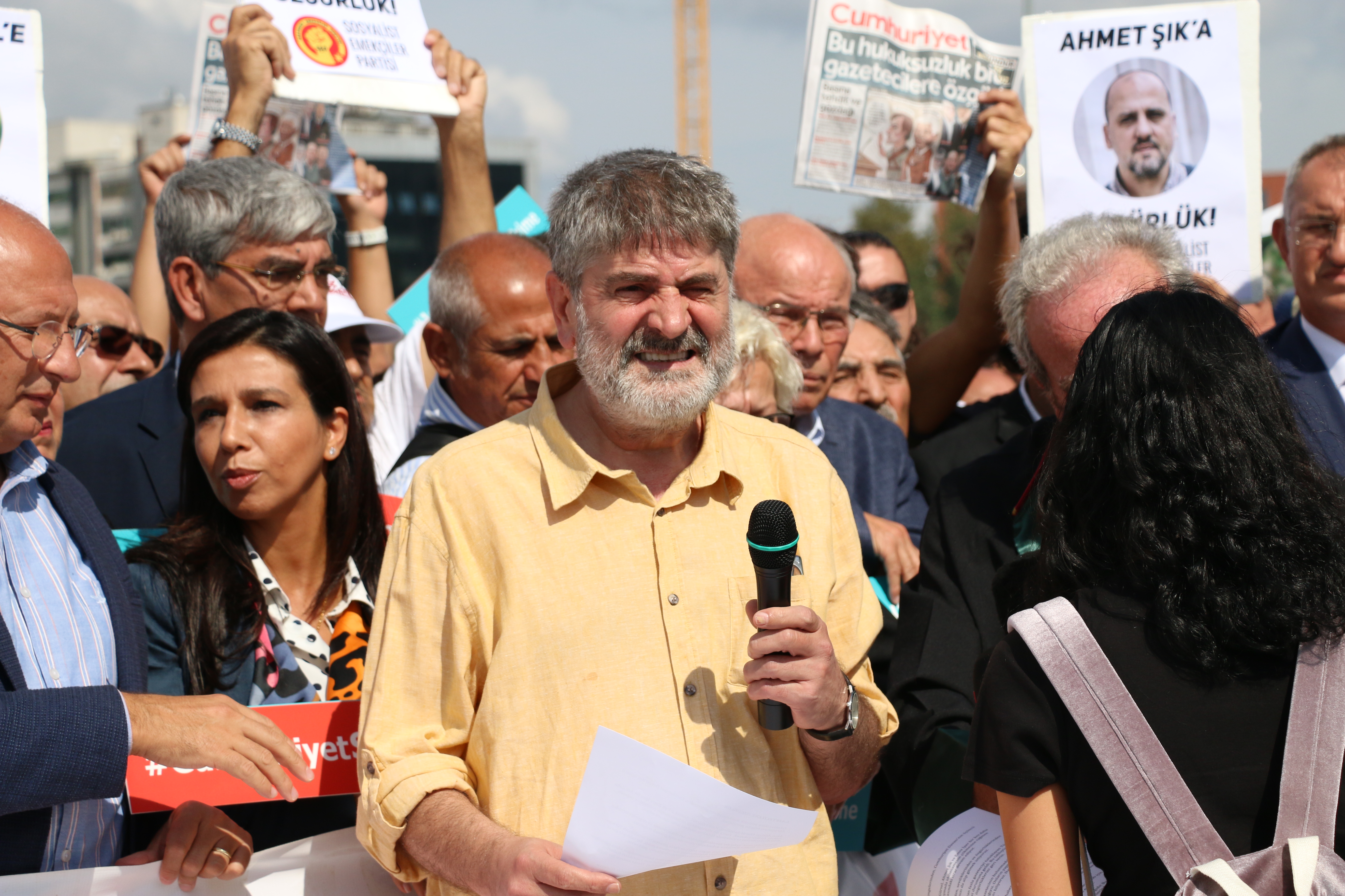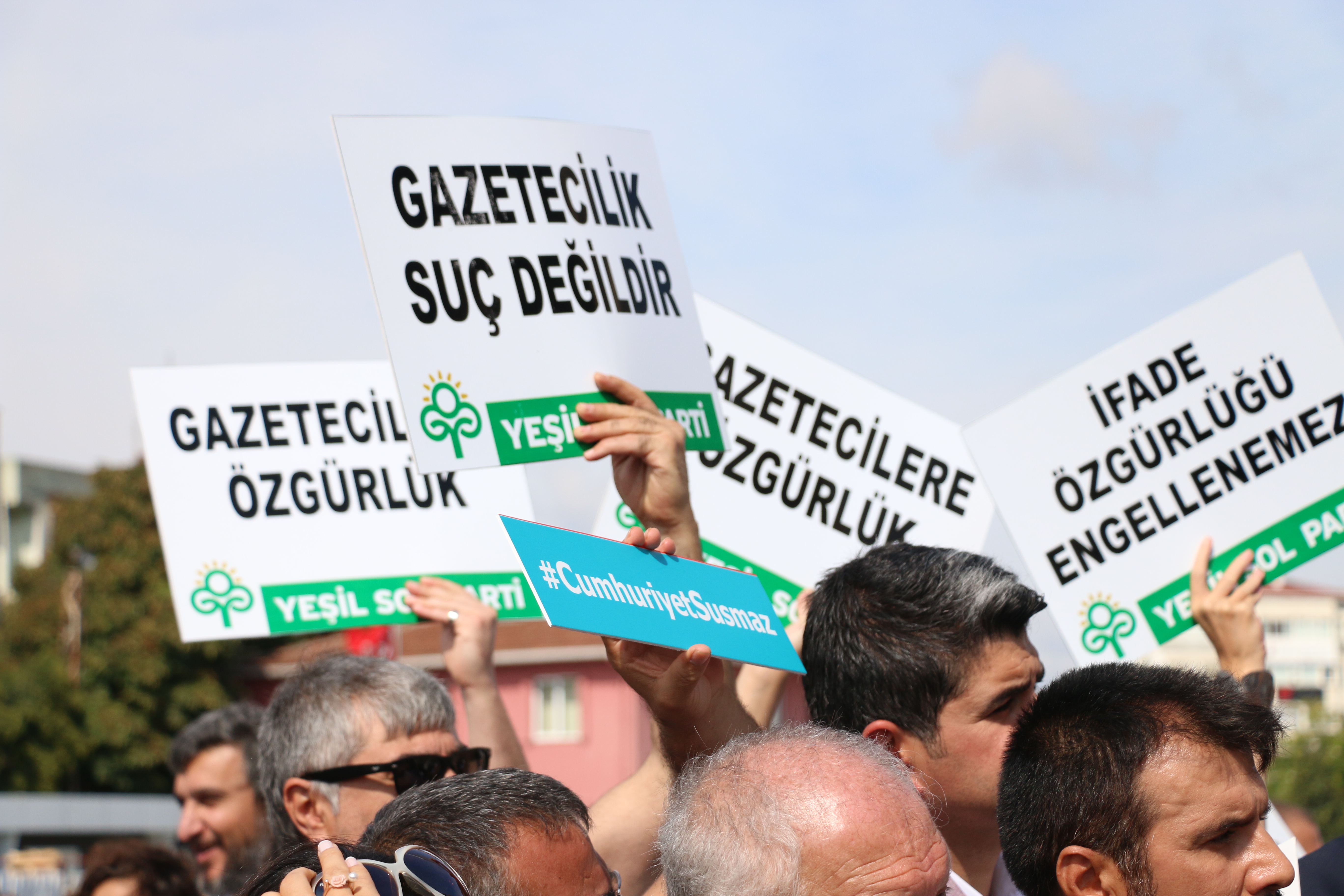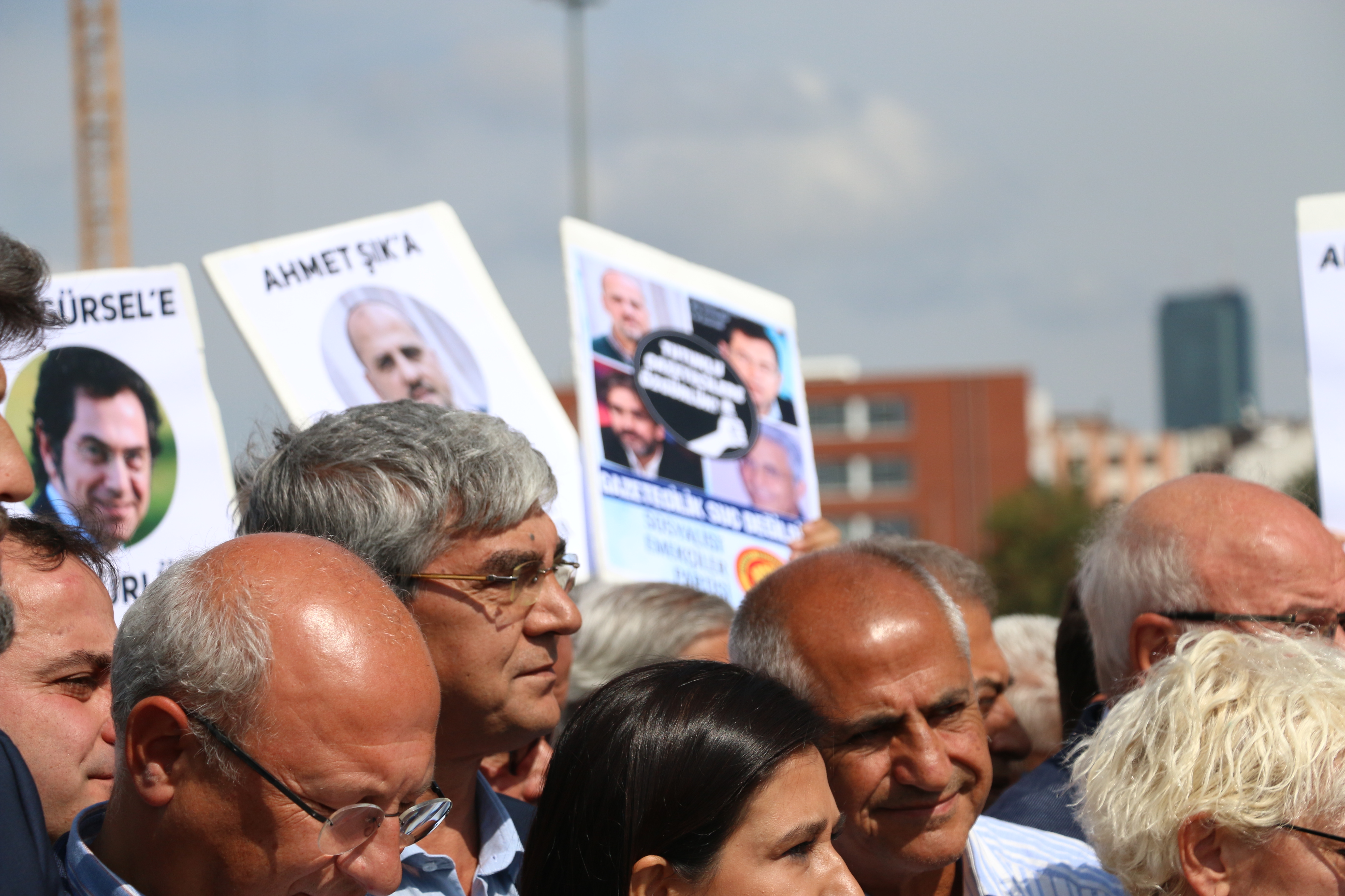 “Herkes için adalet”, “Savunmaya özgürlük herkes için adalet” ve üzerinde tutuklu gazeteciler Ahmet Şık, Kadri Gürsel, Emre İper, Akın Atalay, Murat Sabuncu’nun fotoğraflarının bulunduğu “Gazetecilere özgürlük” yazılı pankartların açıldığı basın açıklamasında “Cumhuriyet susmaz”, “Gazetecilik suç değildir”, “Özgür basın susturulamaz”, “İfade özgürlüğü engellenemez” dövizleri taşındı.