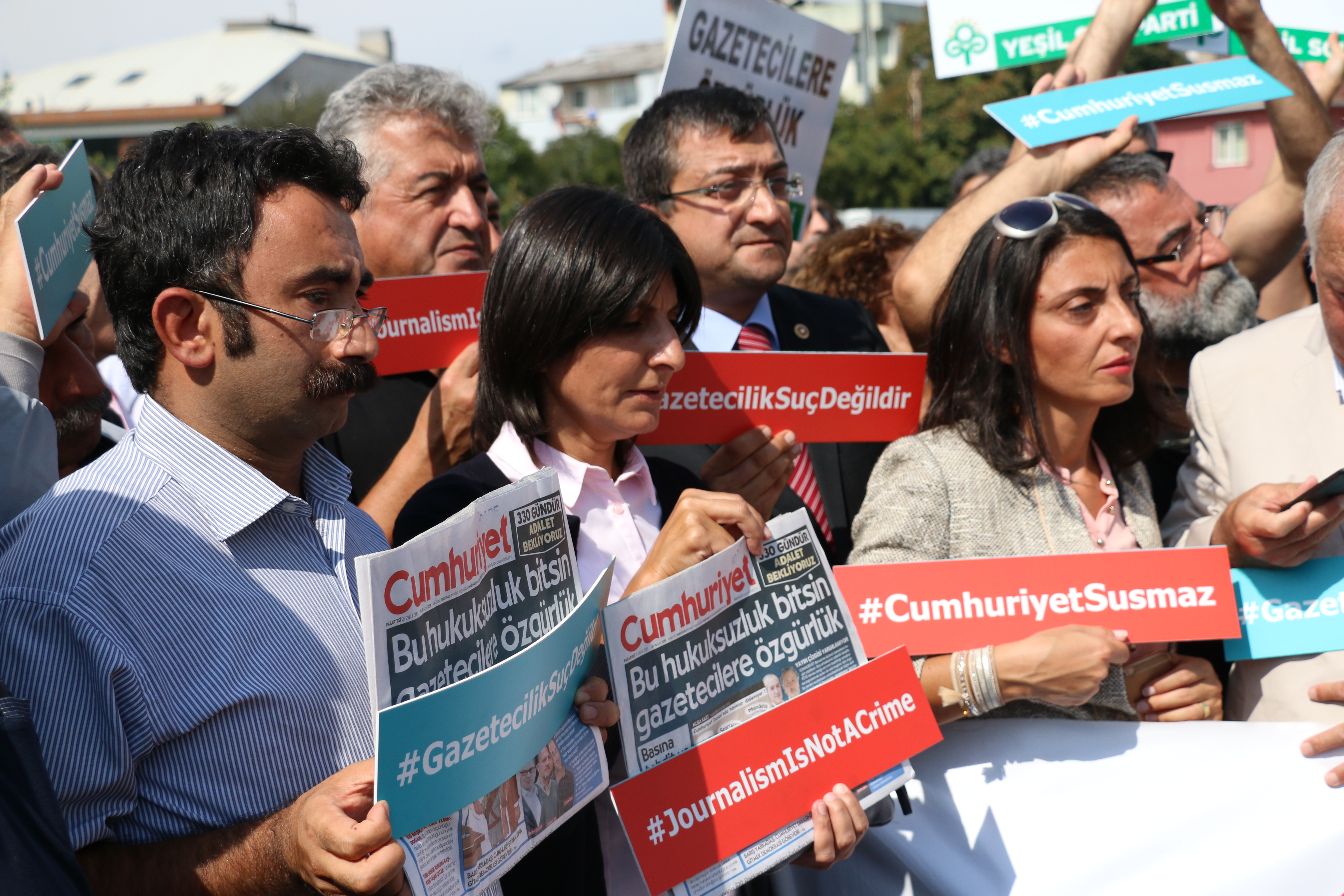 Cumhuriyet gazetesi çalışanlarının yargılandığı davaya birçok CHP ve HDP milletvekillerinin yanı sıra gazeteciler, hukukçular ve Cumhuriyet Gazetesi okurları destek verdi.