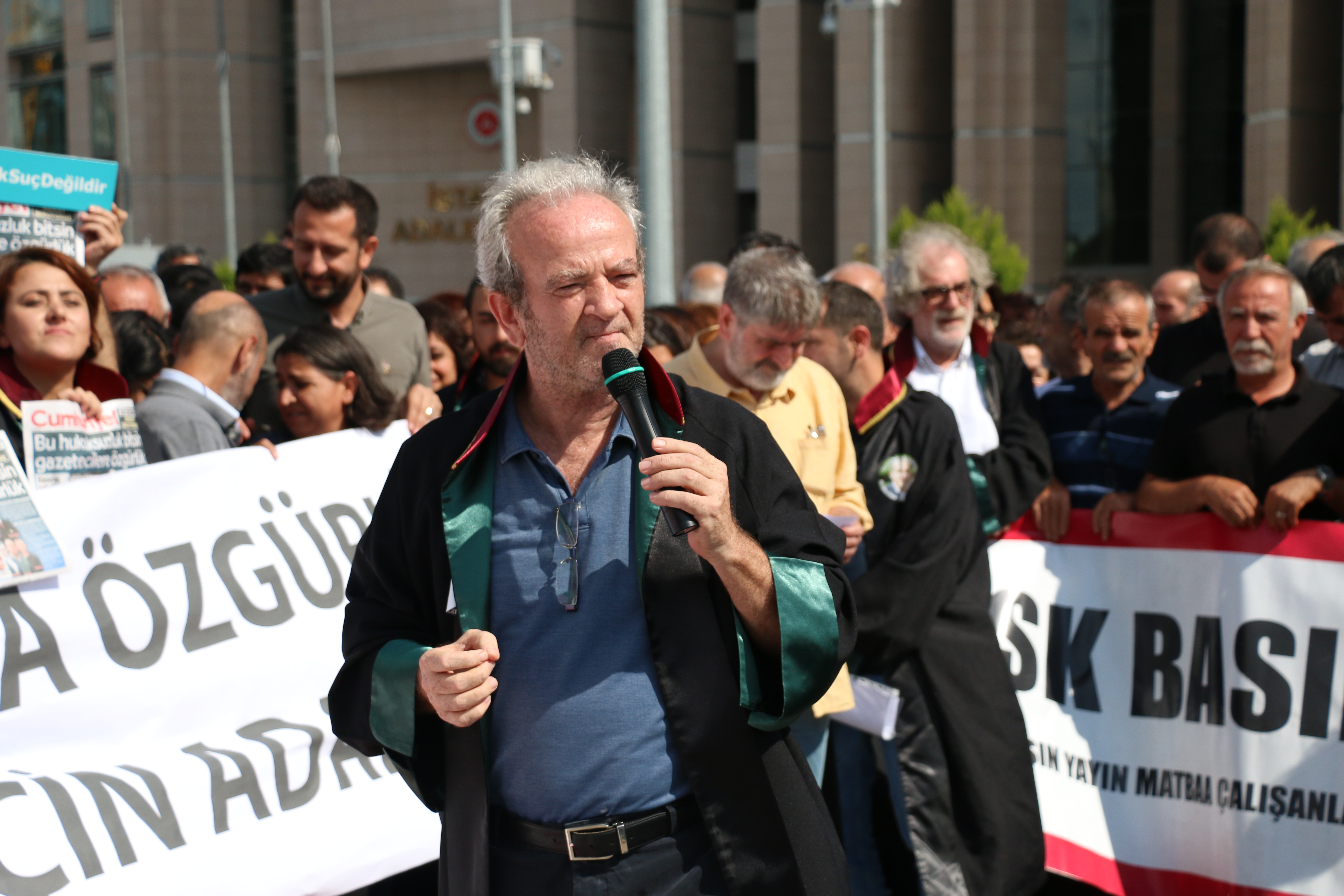 Cumhuriyet Davası Koordinasyonu adına basın açıklamasını yapan gazeteci Faruk Eren, daha ilk duruşmadan iddianamenin çökmesine rağmen gazetecilerin cezaevinde tutulmalarında ısrar edildiğini vurguladı. 160’tan fazla gazeteciyi tutuklayan Türkiye’nin dünyadaki en büyük gazeteci hapishanesi durumuna geldiğini kaydeden Eren, “Bizler arkadaşlarımızın gazeteciliğinin tanığıyız. Onların yaptıkları haberler, yazdıkları yazılar nedeniyle tutuklandıklarını biliyoruz” dedi.