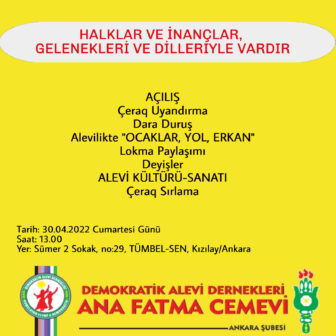 DAD Ana Fatma Cemevi, “Haklar ve inançlar, gelenekleri ve dilleriyle vardır” çağrısı ile Ankara’daki yurttaşları, 30 Nisan Cumartesi saat 13:00’te yapılacak muhabbete davet etti.