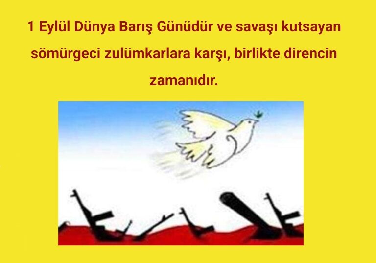 1 Eylül Dünya Barış Günü’dür ve savaşı kutsayan sömürgeci zulümkarlara karşı birlikte direncin zamandır.