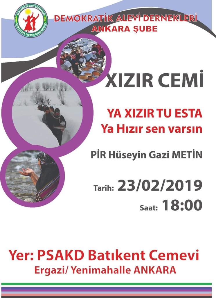 Alevilerin kutsal ayı Xızır ayında Xızır cemleri tutulmaya ve lokmalar pay edilmeye devam ediyor. Demokratik Alevi Derneği (DAD) Ankara Şubesi, bugün Batıkent’teki Pir Sultan Abdal Kültür Derneği Cemevi’nde Xızır cemi gerçekleştirecek. Saat 18:00’de başlayacak olan cemi Hüseyin Gazi Metin Dede yürütecek.