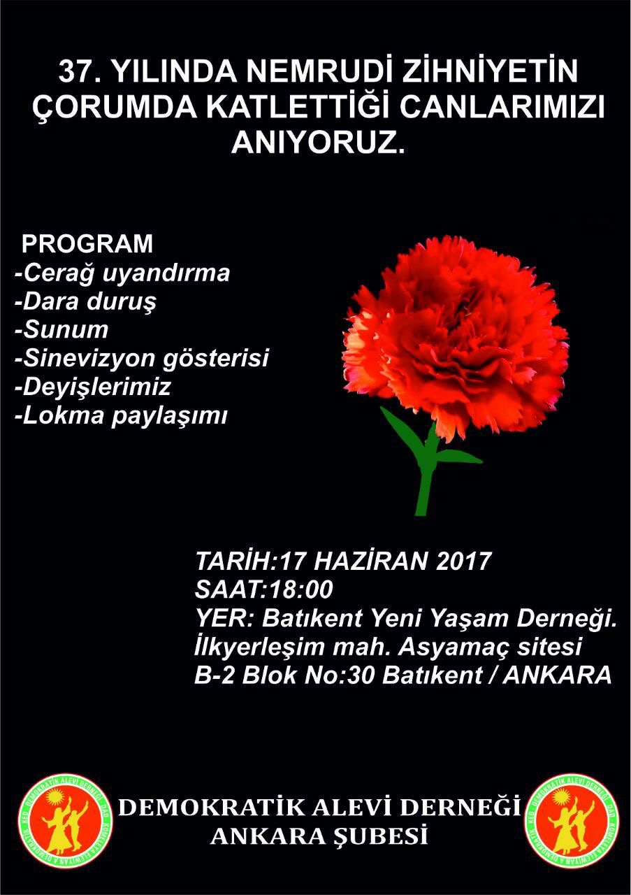 Demokratik Alevi Derneği Ankara Şubesi Çorum katliamının 37. yılında katliamda hayatını kaybeden canları anmak için bir etkinlik düzenleyecek.