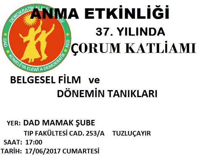 Öte yandan DAD Mamak Şubesi de Çorum katliamına ilişkin bir anma etkinliği düzenleyecek. Belgesel film gösteriminin yapılacağı etkinlikte dönemin tanıkları konuşma yapacaklar. 17 Haziran Cumartesi günü saat 17:00’da başlayacak olan etkinlik Tıp Fakültesi Cad. 253/A Tuzluçayır DAD Mamak Şubesinde gerçekleşecek.