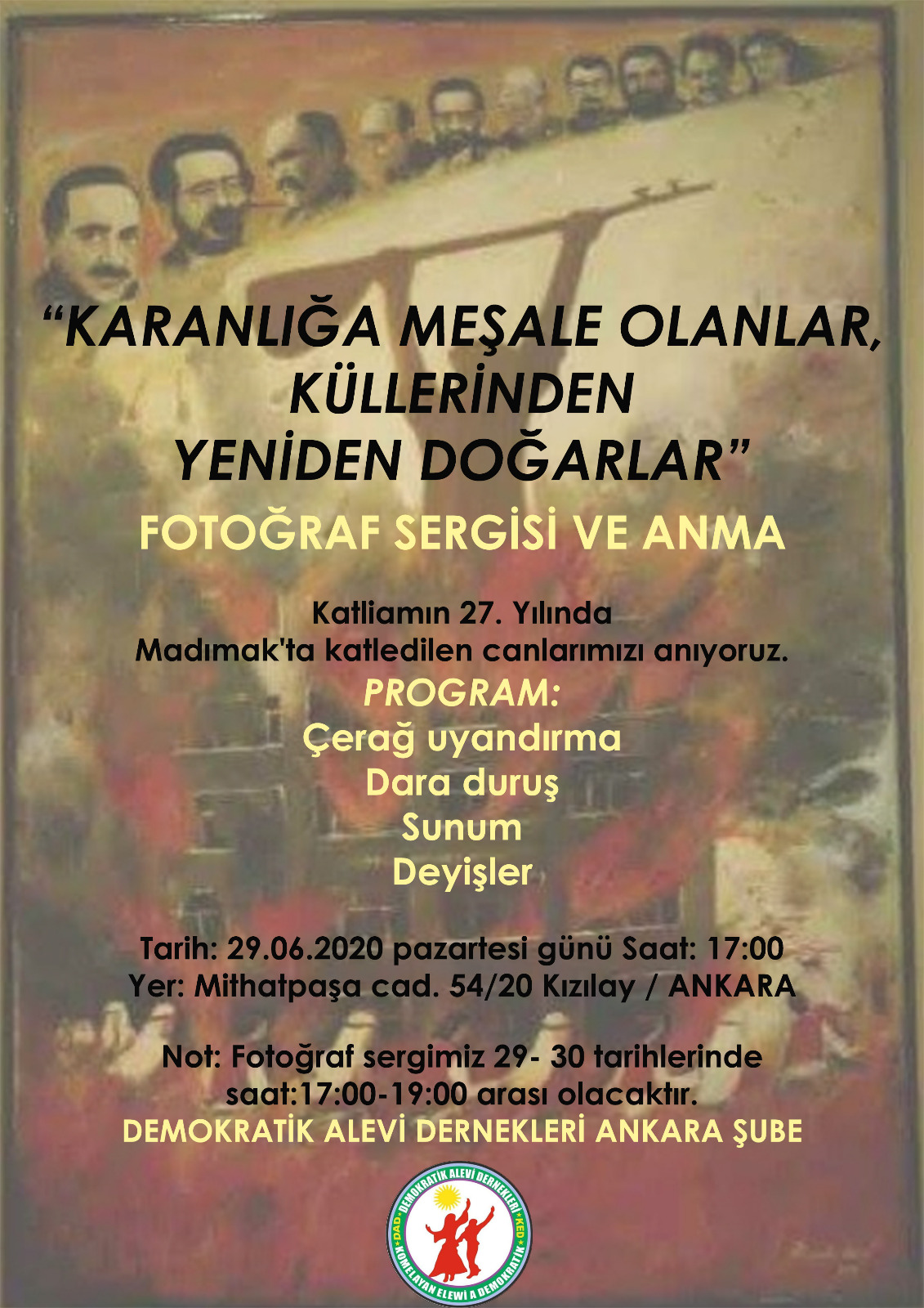 Demokratik Alevi Dernekleri Ankara Şubesi, anma etkinliğini 29 Haziran Pazartesi günü saat:17:00’de gerçekleştirecek.