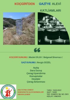 PİRHA – Ana Fatma Cemevi Demokratik Alevi Dernekleri (DAD) Ankara Şubesi, “Koçgiri’den Gazi’ye Alevi Katliamları” başlıklı anma programı düzenliyor.