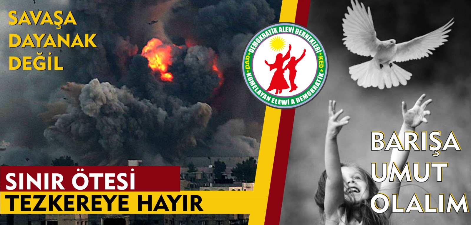 Demokratik Alevi Dernekleri (DAD) “Savaşa dayanak değil, Barışa umut olalım” başlıklı bir açıklama yayımlayarak, Türkiye Büyük Millet Meclisi’nde (TBMM) görüşülecek olan tezkereye hayır oyu verilmesi çağrısında bulundu. DAD açıklamasında, “Savaşlar acılar üretir, travmalar üretir. Bunları telafi etmek kısa zamanlarda mümkün değildir. Muhalefetin halklara barış için imkan yaratması beklenirken, savaş ardında sıralanması, gelecekte aynı politikaları üreteceğinin temel kanıtıdır. Güvenlerimizi sarsmaktadır” ifadelerini kullandı.