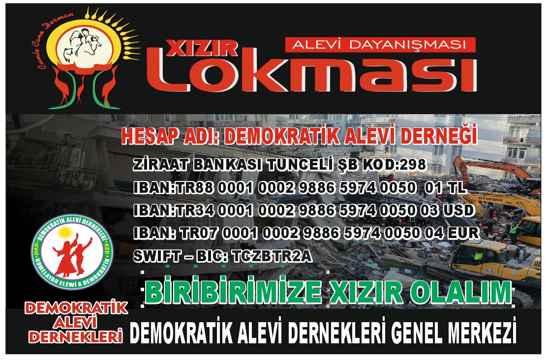 Bu kapsamda Demokratik Alevi Dernekleri Genel Merkezi, herkesin birbirine Xızır olmasını verdi. Demokratik Alevi Derneği adına Ziraat Bankası Tunceli Şubesi’nde açılan hesapta IBAN nurası verilerek 1TL yatırılması istenerek, “Alevi dayanışması, Xızır lokması. Birbirimize Xızır olalım” denildi.