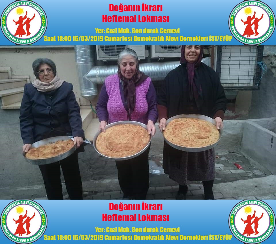 Demokratik Alevi Derneği İstanbul Şubeleri, bugün saat. 18.00’da Pir Sultan Abdal Kültür Derneği Sultangazi Cemevi’nde geleneksel Heftemal Lokması verecek.