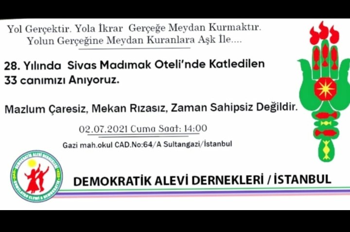 Demokratik Alevi Dernekleri (DAD) İstanbul Şubesi Sivas Katliamı’nda yaşamını yitiren 33 insanı, 2 Temmuz günü saat 14:00’te Gazi Mahallesi’nde anacak.
