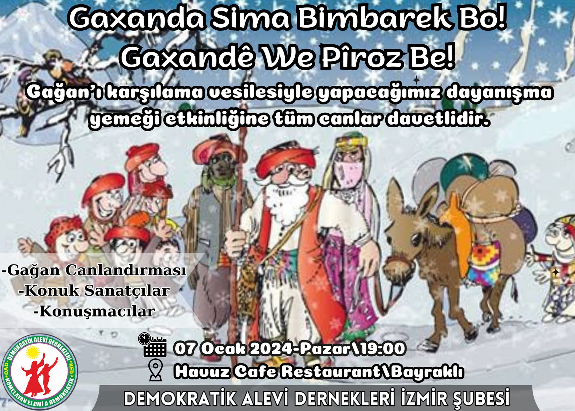 Demokratik Alevi Dernekleri (DAD) İzmir Şubesi, 7 Ocak’ta saat 19.00’da Havuz cafe Restaurant’ta Gaxan kutlaması yapacak.