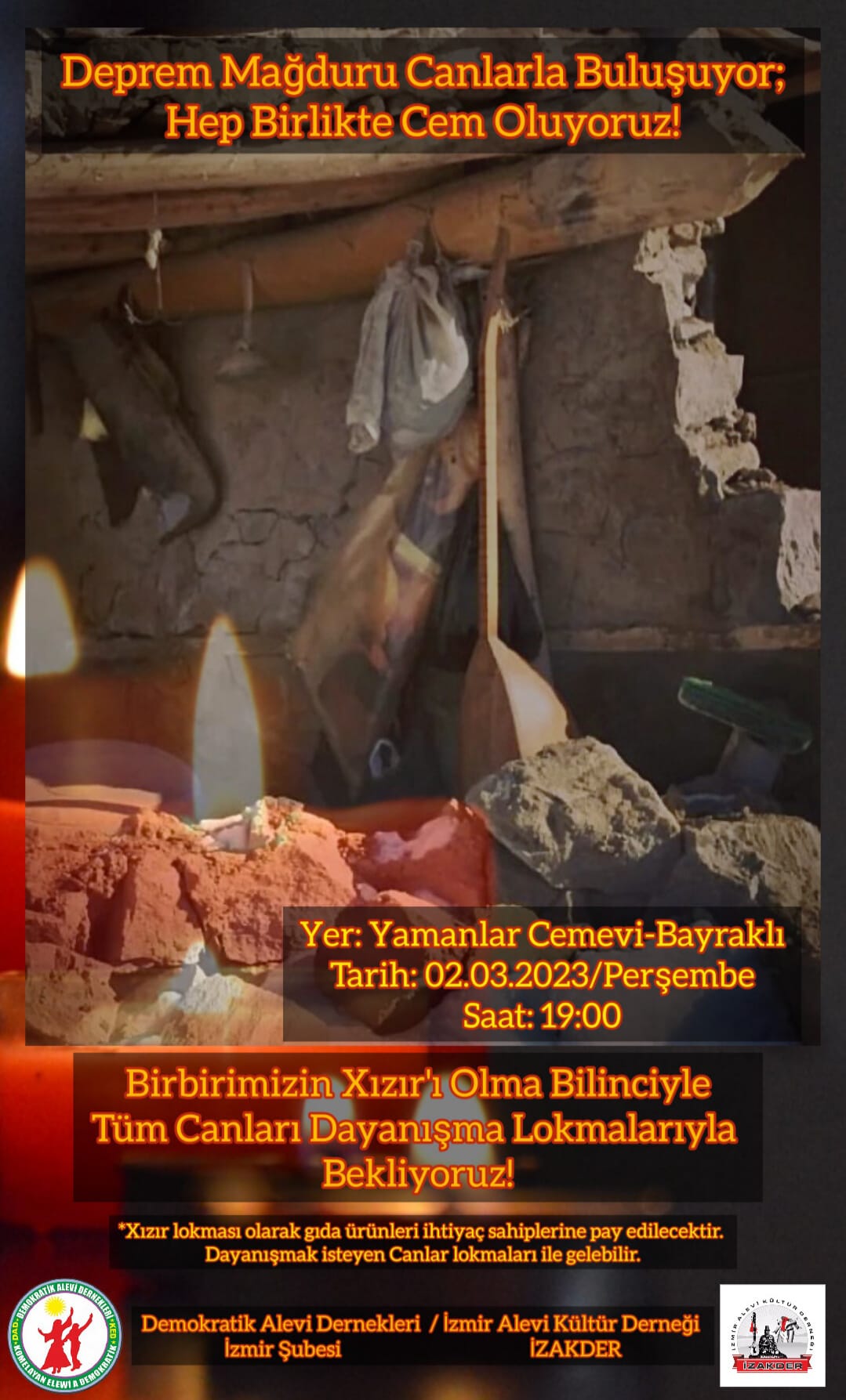 Xızır aylarında 10 ili vuran deprem sonrasında Alevi toplumu lokmalarını depremden etkilenen canlarla paylaşıyor. Bu kapsamda Demokratik Alevi Dernekleri İzmir Şubesi ve İzmir Alevi Kültür Derneği Yamanlar Cemevi, depremden etkilenen canlarla cem olacak.