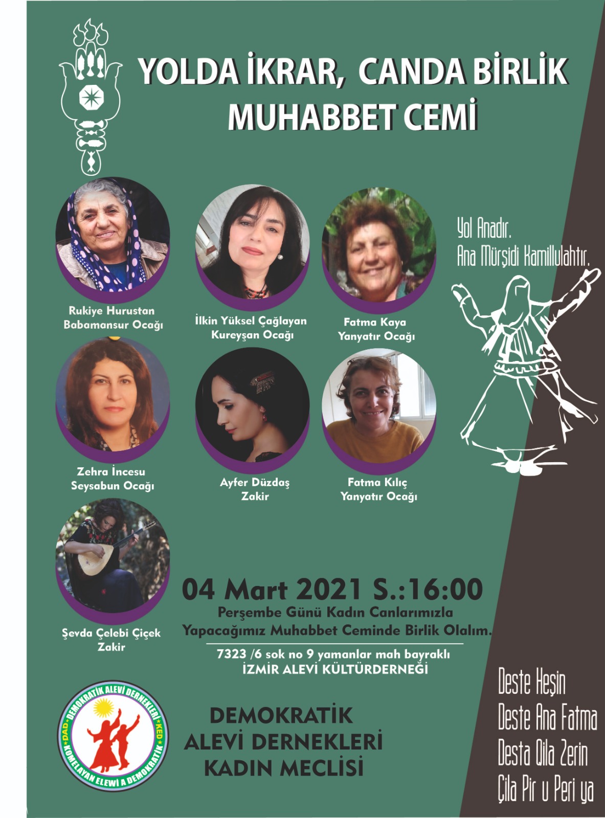 4 Mart Perşembe günü saat 16.00’da Yamanlar Bayraklı’da bulunan İzmir Alevi kültür Derneği’nde yapılacak muhabbet cemine, Babamansur Ocağı’ndan Rukiye Hurustan, Kureyşan Ocağı’ndan İlkin Yüksel Çağlayan, Yanyatır Ocağı’ndan Fatma Kaya, Seysabun Ocağı’ndan Zehra İncesu, Zakirler Ayfer Düztaş, Sevda Çelebi Çiçek, Yanyatır Ocağı’ndan Fatma Kılıç katılacaklar.