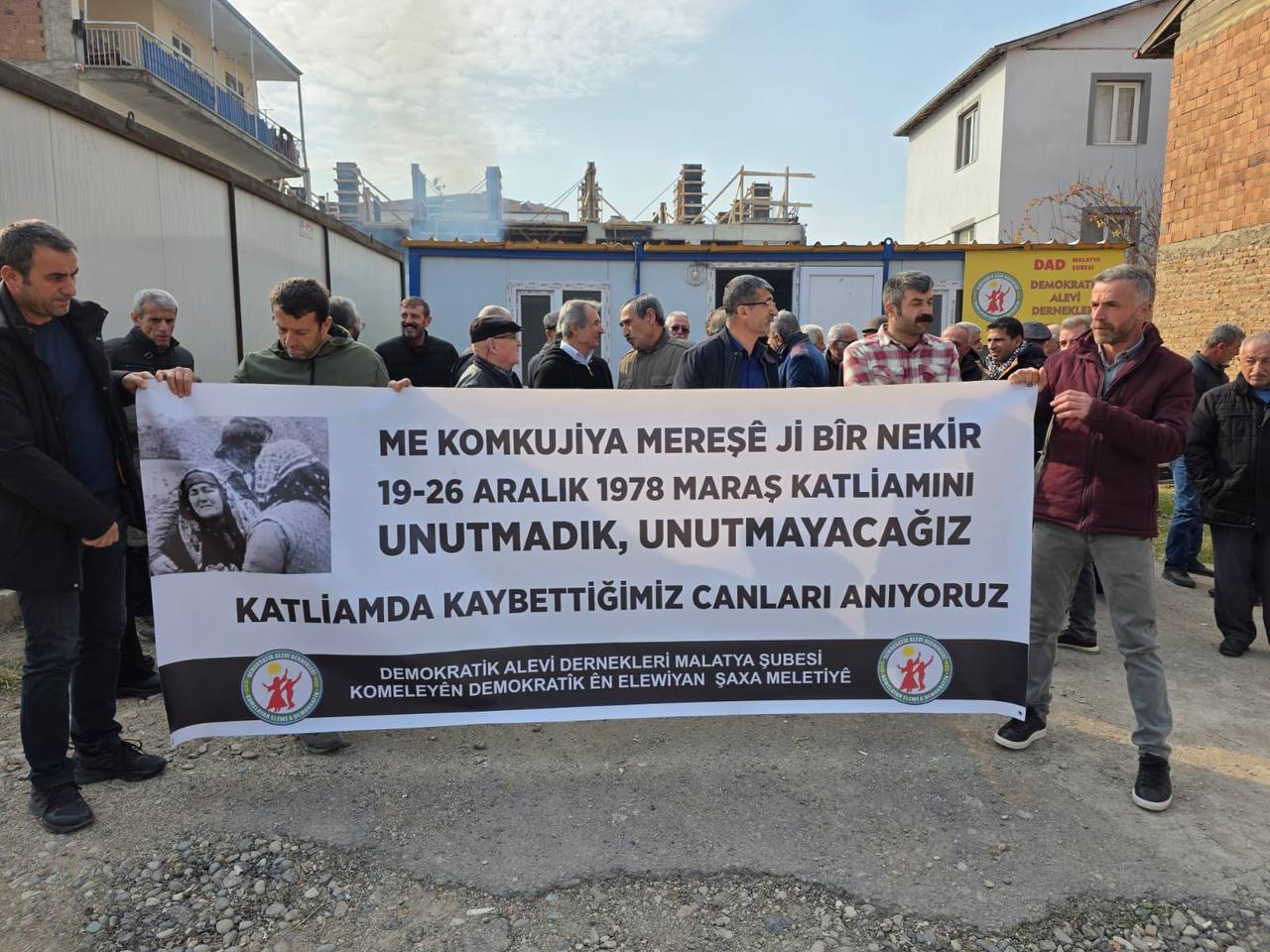 DAD Malatya Şubesi binası önünde gerçekleştirilen basın açıklamasının Kürtçesini Gökhan İmer, Türkçesini ise Onur Özkul okudu. Açıklamada, Maraş Katliamı’nın Alevi halkına yönelik tarihsel saldırı zincirinin önemli halkalarından biri olduğu ifade edildi.
