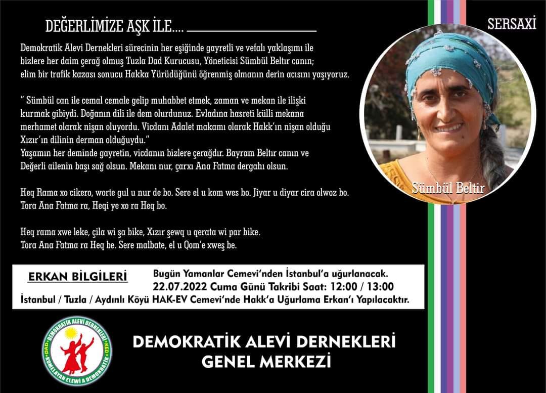 “Demokratik Alevi Dernekleri sürecinin her eşiğinde gayretli ve vefalı yaklaşımı ile bizlere her daim çerağ olmuş Tuzla DAD kurucusu, yöneticisi Sümbül Beltir canın; elim bir trafik kazası sonucu Hakk’a yürüdüğünü öğrenmiş olmanın derin acısını yaşıyoruz.