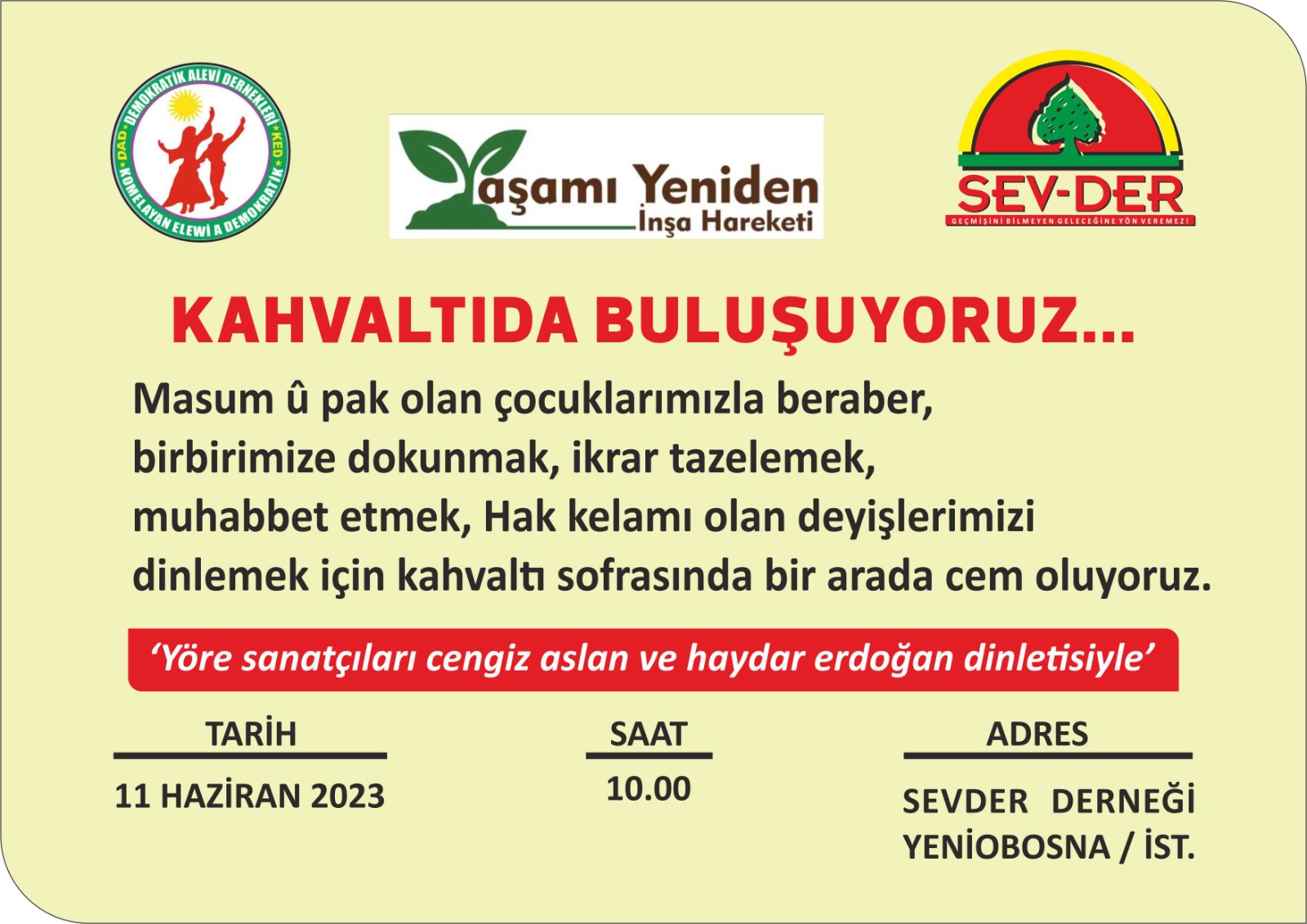 Demokratik Alevi Dernekleri (DAD) ve SEV-DER, 11 Haziran Pazar günü saat 10.00’da Yenibosna SEVDER Derneği’nde ortak kahvaltı etkinliği düzenleyecek.