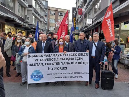 KESK Samsun Şubeler Platformu, “İnsanca yaşamaya yetecek gelir ve güvenceli çalışma için halktan, emekten yana bir bütçe istiyoruz” diyerek sokağa çıktı. Yapılan basın açıklamasında, iktidarın ekonomi politikaları eleştirilerek “Faizden, ranttan, bizim cebimizden verilen hazine garantilerinden beslenen, kazancını vergi cennetlerine transfer eden mutlu azınlığın serveti büyüyor. Bizim payımıza ise vergi cehennemi düşüyor” denildi.