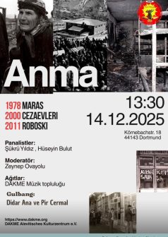 PİRHA- Dortmund ve Çevresi Alevi Kültür Merkezi (DAKME), Maraş Katliamı, 19 Aralık Cezaevleri Katliamı ve Roboski Katliamları için anma etkinliği düzenledi. Zeynep Ovayolu moderatörlüğünde gerçekleştirilen panele, Şükrü Yıldız ve Hüseyin Bulut katıldı. Anma DAKME Müzik Topluluğu’nun yaktığı ağıtlar ile sona erdi.