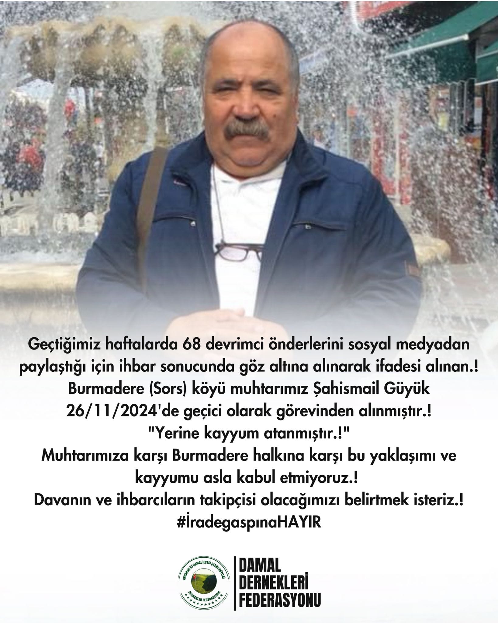 “Geçtiğimiz haftalarda 68 devrimci önderlerini sosyal medyadan paylaştığı için ihbar sonucunda göz altına alınarak ifadesi alınan Burmadere (Sors) köyü muhtarımız Şahismail Güyük 26/11/2024’te geçici olarak görevinden alınmıştır. Yerine kayyum atanmıştır! Muhtarımıza karşı Burmadere halkına karşı bu yaklaşımı ve kayyumu asla kabul etmiyoruz! Davanın ve ihbarcıların takipçisi olacağımızı belirtmek isteriz!”
