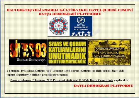 PİRHA – Hacı Bektaş Veli Anadolu Kültür Vakfı Datça Şubesi Cemevi ve Datça Demokrasi Platformu, 2 Temmuz Sivas Katliamı ve 3 Temmuz Çorum Katliamı’na ilişkin 2 Temmuz Pazartesi Günü Datça Cemevi’nde basın açıklaması gerçekleştirecek.