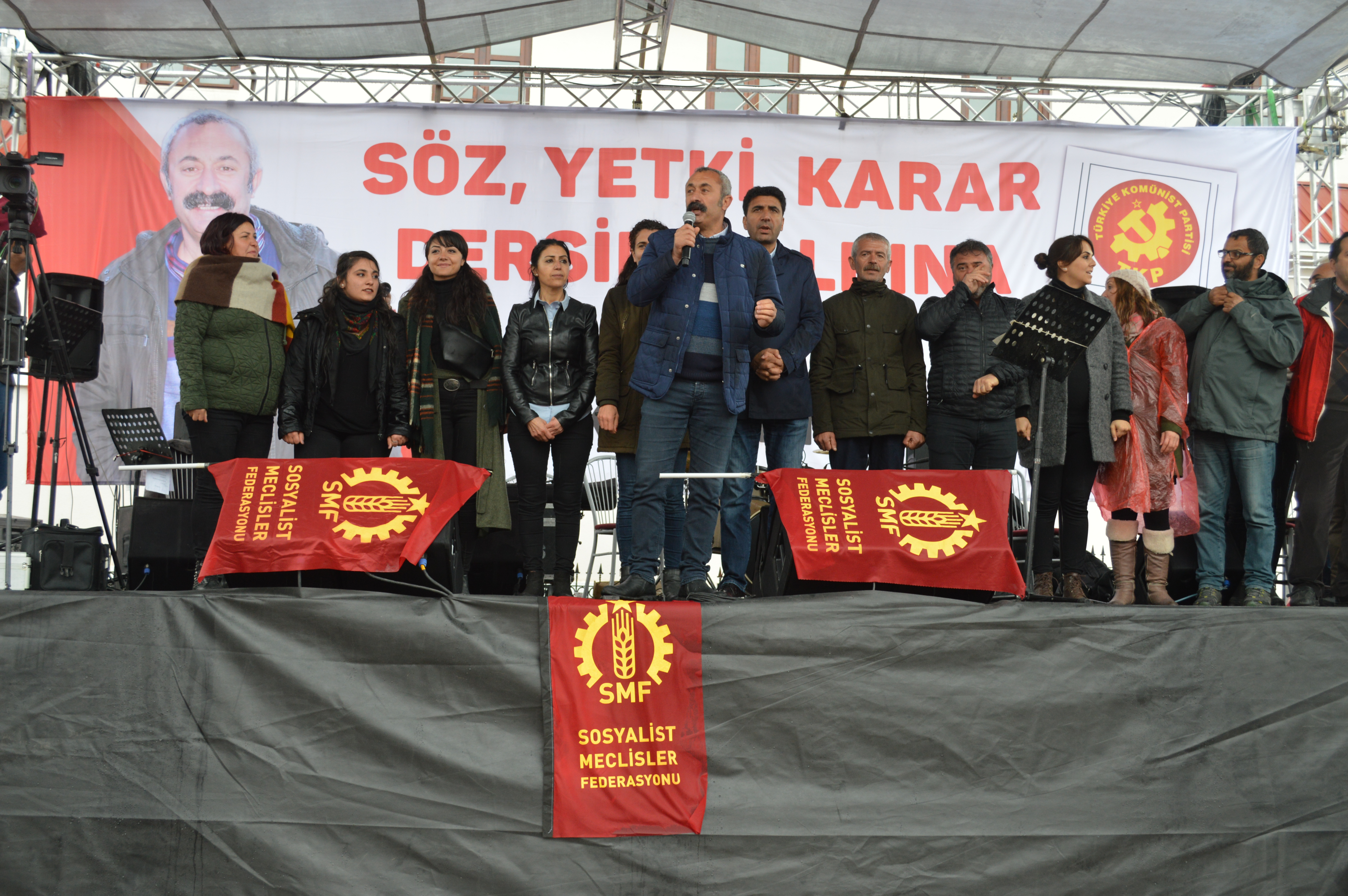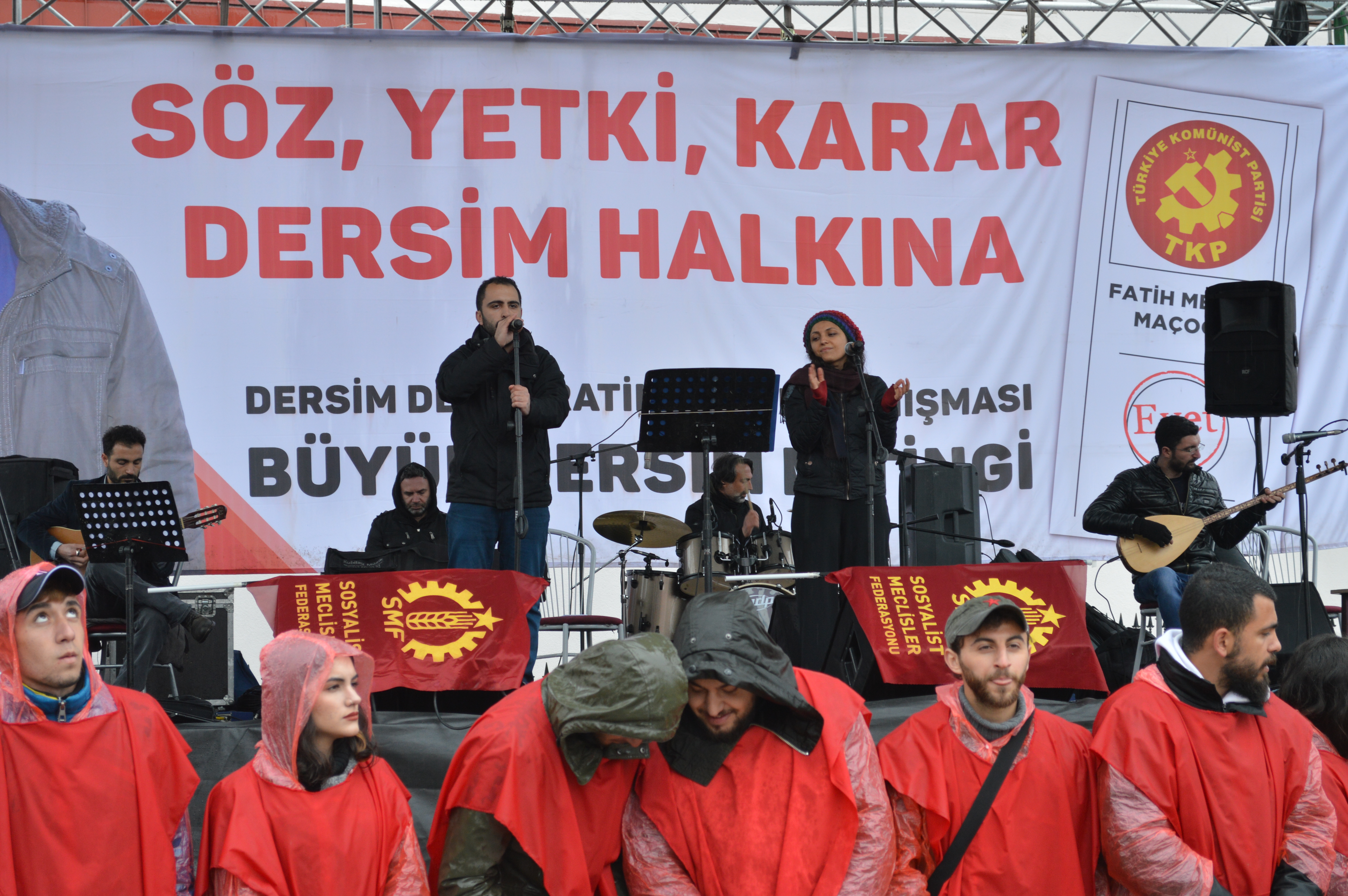 Grup munzur, Nejat Yavaşoğulları, Umut Altınçağ’ın sahne aldığı mitingde sunumu Orhan Aydın ve Fatoş Yiğit yaptı. Sosyalist Meclisler Federasyonu (SMF) adına konuşan Mehmet Ali Eser, “İki aydan beri söz yetki karar halka şiarıyla yürüttüğümüz seçim çalışmasının son aşamasındayız. Biz küresel koşullarda bu küçücük il de dünyaya ışık olan bir yönetim anlayışıyla, dünyanın dikkatini çekmiş bulunuyoruz. Biz tarihten beslenerek buraya geldik. Denizlerin. Mahirlerin, İboların açtığı yoldan beslenerek buraya geldik yani Biz tarihin sonucuyuz. Ser verip sır vermeyenlerin yoldaşlarıyız” diye konuştu.