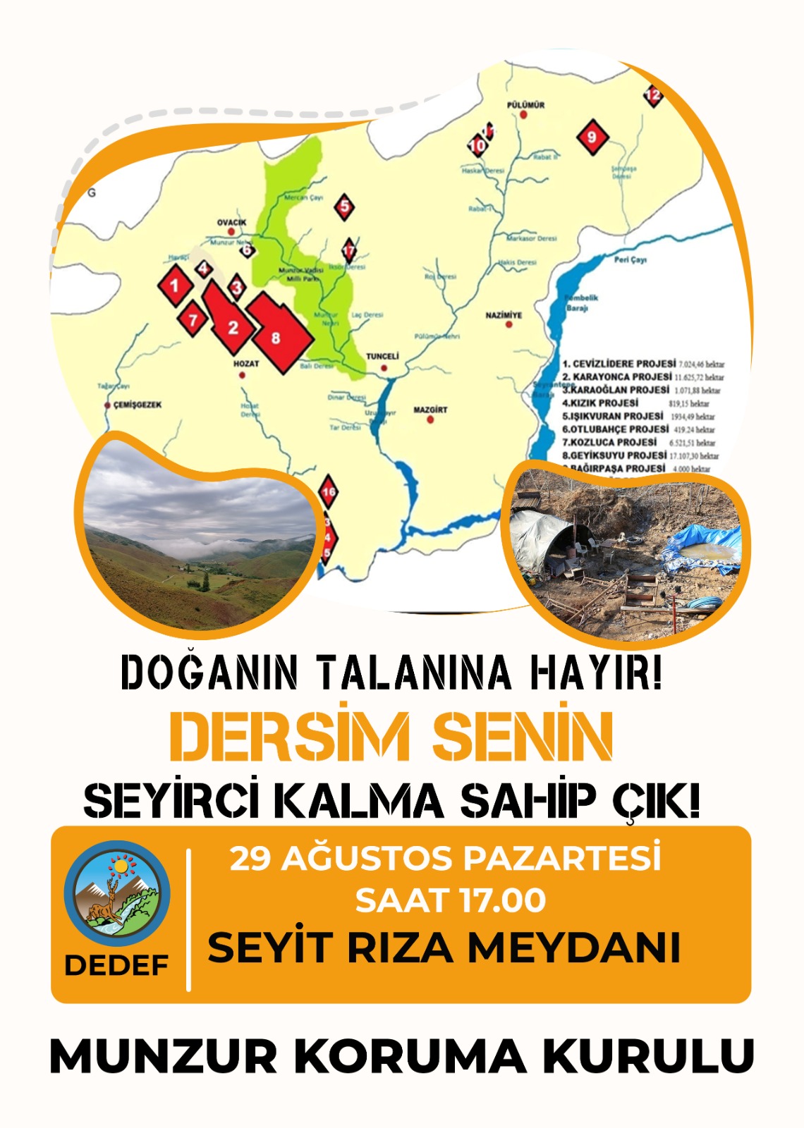 Dersim’de ki doğa talanına karşı 29 Ağustos’ta Seyit Rıza Meydanı’nda buluşacaklarını duyuran Munzur Koruma Kurulu (DEDEF), yazılı açıklama yaptı.