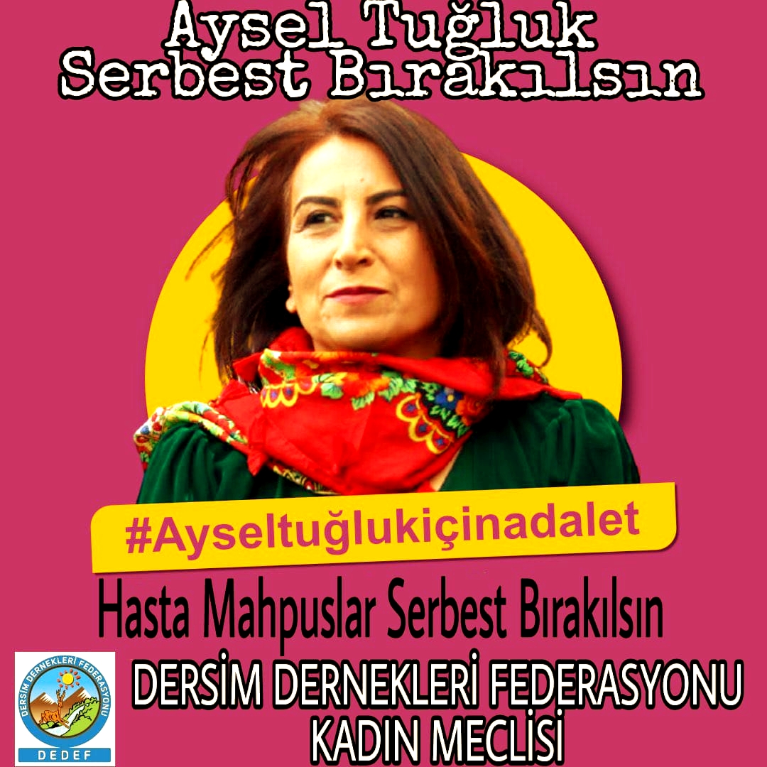 “Hemşerimiz Aysel Tuğluk uzun bir süredir mahpus. Annesinin cenazesine yapılanlar ile birlikte geri dönüşümü zor bir hastalık ile yaşamaya başladı” diyen DEDEF Kadın Meclisi, “Bugün hastaneye kaldırıldığını öğrendiğimiz Tuğluk’un serbest bırakılmasını istiyoruz. Annesinin cenazesine yapılanları bir kez daha kınıyoruz. Tuğluk şahsında tüm hasta mahpusların bir an evvel serbest bırakılmasını ve tedavilerinin özgür şartlarda gerçekleştirmesini talep ediyoruz. Bizler Dersim Dernekleri Federasyonu Kadın Meclisi olarak hapishanelerde yaşanan bu vahşetin ve kötü şartların bir an evvel son bulmasını talep ediyoruz ve tüm kamuoyunu bu anlamda duyarlılığa çağırıyoruz. Aysel Tuğluk serbest bırakılsın. Hasta mahpuslar serbest bırakılsın. Tecrit uygulamaları son bulsun” ifadelerini kullandı.