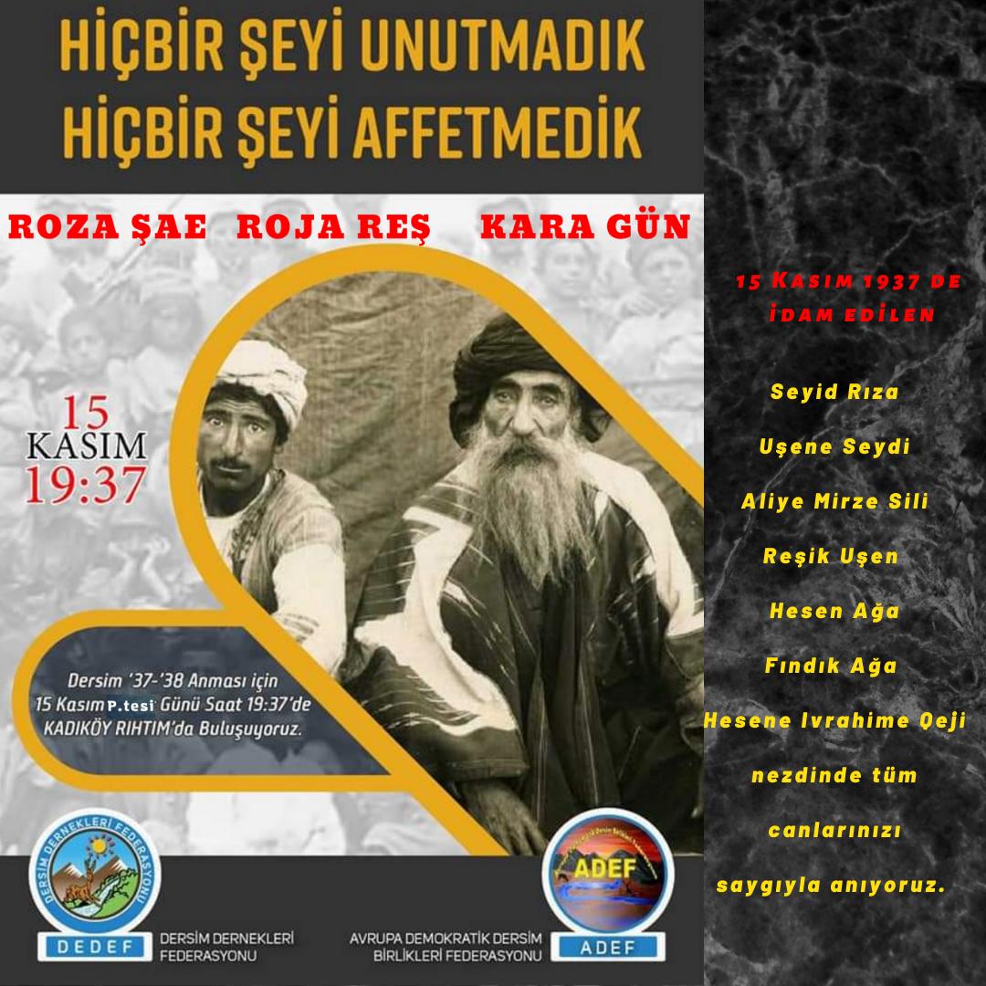Dersim Dernekleri Federasyonu (DEDEF), yazılı bir açıklama yaparak, “İnsanlığın bu kara lekesinin aydınlatılması için 15 Kasım Pazartesi saat 19.37 ‘de Kadıköy Rıhtım’da buluşuyoruz” dedi.