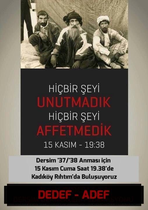 ‘İnsanlığın bu kara lekesinin aydınlatılması için bir mum da sen yak’ şiarı ile en başta Dersim merkez olmak üzere Ankara, Adana, Mersin, İzmir, Bursa, İzmit, Gemlik, Gebze ve örgütlü olduğumuz her yerde 15 Kasım Cuma günü saat 19.37’de buluşacağız.