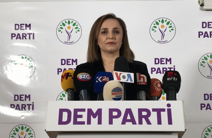 Halkların Eşitlik ve Demokrasi Partisi (DEM Parti) Sözcüsü Ayşegül Doğan, Hakkari Belediyesi’ne kayyım atanmasına dair başlatacakları kampanyaya dair partisinin genel merkezinde basın toplantısı düzenledi. Kayyım politikalarına dair “İflas eden rejimin son çırpınışlarını görüyoruz” ifadesini kullanan Doğan, AKP’li Cumhurbaşkanı Erdoğan’ın, “Kanun yok, hukuku işletiyoruz” sözünü hatırlattı.