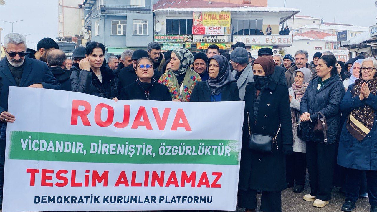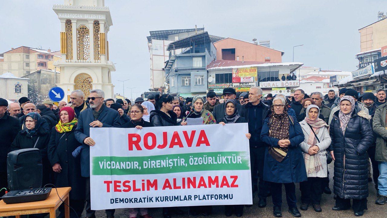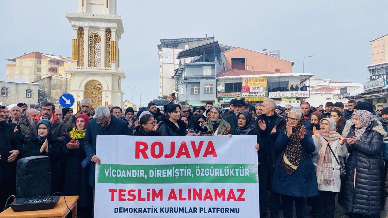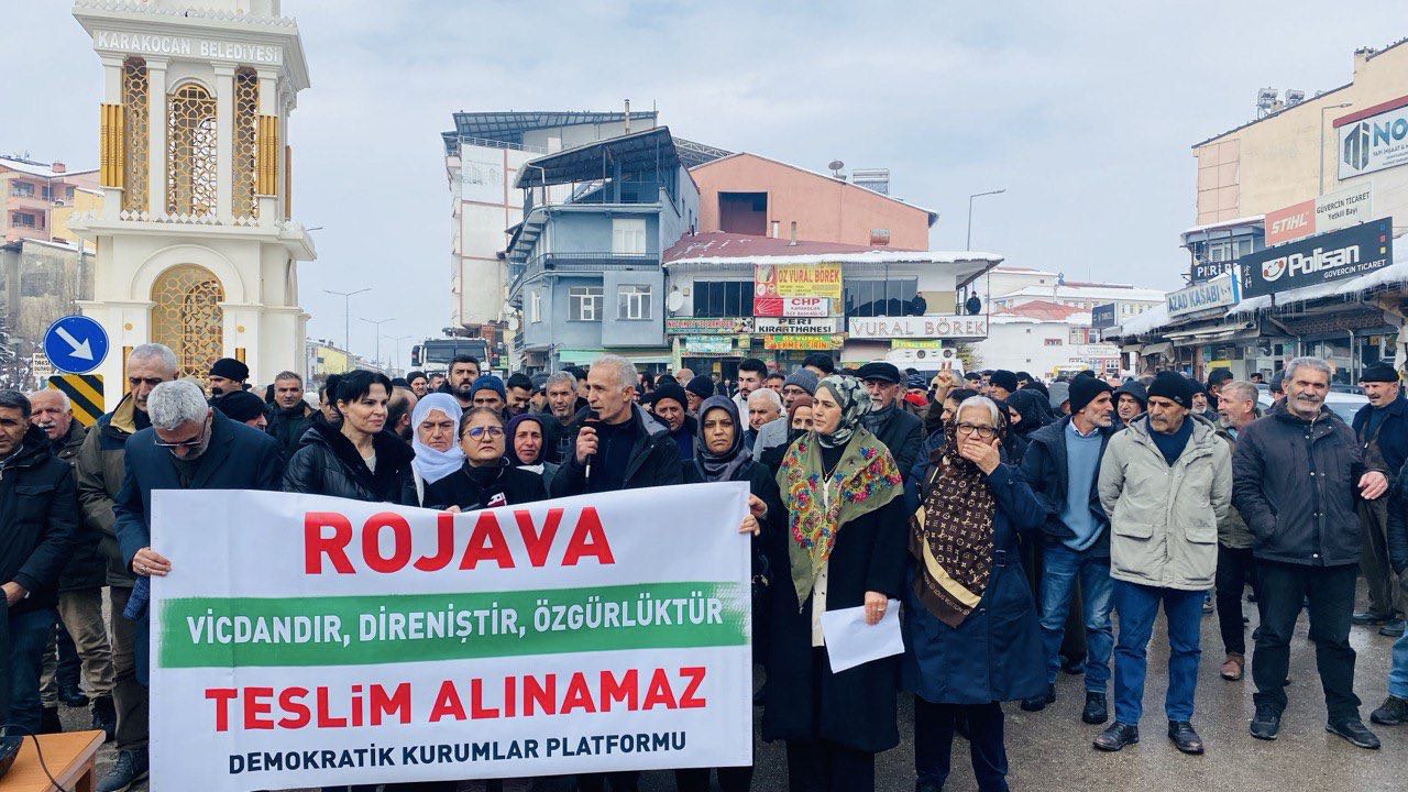 PİRHA-Elazığ Karakoçan’da konuşan DEM Parti yöneticileri ve demokratik kurumlar, Rojava’da sivilleri hedef alan saldırıların bir halkı tasfiye etme girişimi olduğunu belirterek, “Kürt halkının uzattığı barış eli tutulmalı, halklar arasında eşit ve onurlu bir yaşam birlikte inşa edilmelidir” çağrısı yaptı.