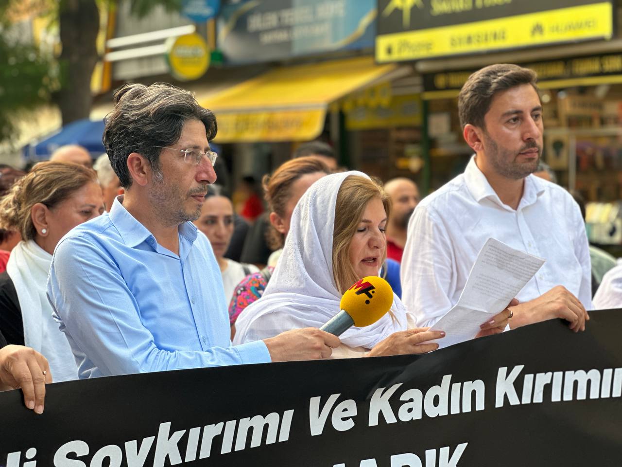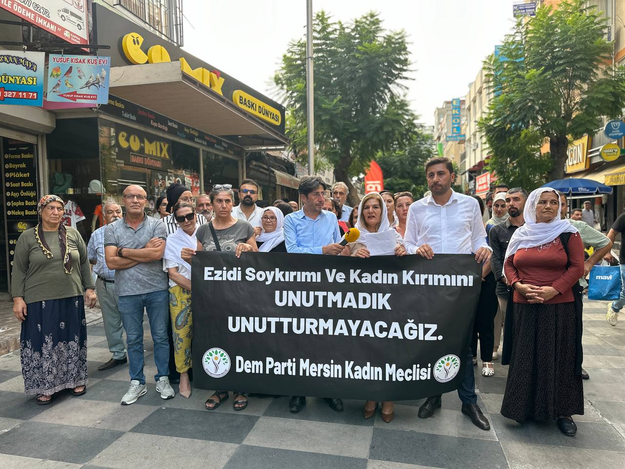 3 Ağustos 2014’te IŞİD çeteleri tarafından Şengal’de 5 binden fazla Ezidi katledilmiş, çoğu kadın ve çocuk olmak üzere binlerce Ezidi kaçırılmıştı. Katliamın yıldönümünde Halkaların Eşitlik ve Demokrasi Partisi (DEM Parti) Mersin İl Örgütü, Ezidi halkına yönelik gerçekleştirilen saldırıya ilişkin il binası önünde basın açıklaması yaptı. Açıklamayı DEM Parti Mersin İl Eş Başkanı Bedriye Kuş okudu.