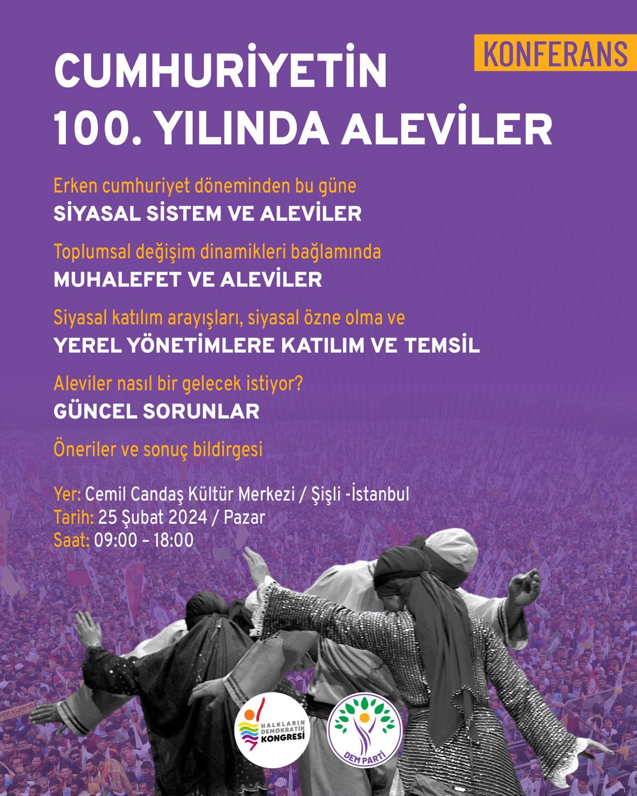 Halkların Eşitlik ve Demokrasi Partisi (DEM Parti) ve Halkların Demokratik Kongresi (HDK), 25 Şubat Pazar günü saat 09.00-18.00 arasında İstanbul’da Cemil Candaş Kültür Merkezi’nde ‘Cumhuriyetin 100. Yılında Aleviler’ konulu konferans gerçekleştirecek.