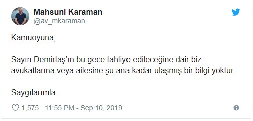 Selahattin Demirtaş’ın avukatı Mahsuni Karaman, sosyal medyada yapılan ‘tahliye’ haberlerini yalanlayarak, “Sayın Demirtaş’ın bu gece tahliye edileceğine dair biz avukatlarına veya ailesine şu ana kadar ulaşmış bir bilgi yoktur.” dedi. (HABER MERKEZİ)