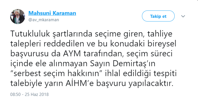 “Tutukluluk şartlarında seçime giren, tahliye talepleri reddedilen ve bu konudaki bireysel başvurusu da AYM tarafından, seçim süreci içinde ele alınmayan Sayın Demirtaş’ın “serbest seçim hakkının” ihlal edildiği tespiti talebiyle yarın AİHM’e başvuru yapılacaktır.”