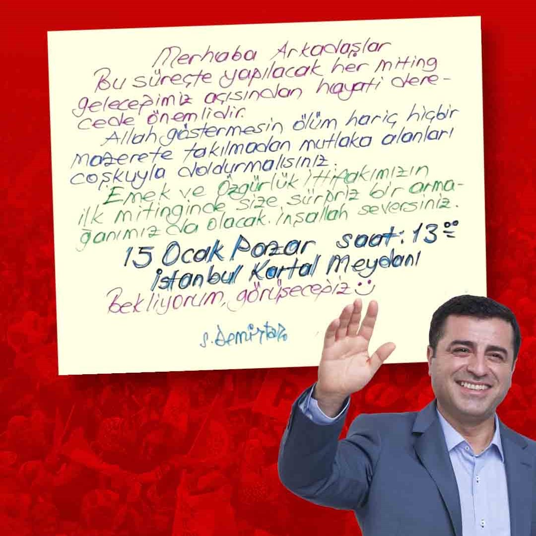 Demirtaş paylaşımında, “Günaydın. Rojbaş. Sabah ul hayr. Bugün saat 1’de, Kartal Meydanındaki mitingdeyiz, değil mi? Kim kimi kapatacakmış, AKP’ye de AYM’ye de gösterelim. Ben yola çıktım, geliyorum, halayda buluşalım #EmekveÖzgürlükİçin” ifadelerini kullandı.