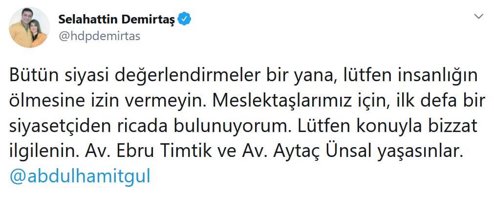 “Bütün siyasi değerlendirmeler bir yana, lütfen insanlığın ölmesine izin vermeyin. Meslektaşlarımız için, ilk defa bir siyasetçiden ricada bulunuyorum. Lütfen konuyla bizzat ilgilenin. Av. Ebru Timtik ve Av. Aytaç Ünsal yaşasınlar.”