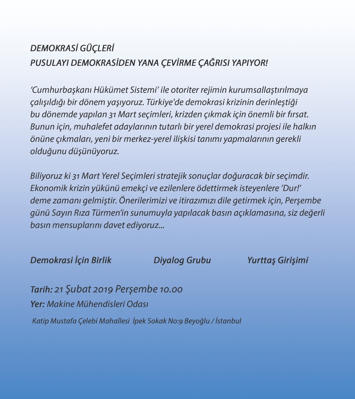 Demokrasi İçin Birlik, Diyalog Grubu ve Yurttaş Girişimi, 21 Şubat Perşembe Günü saat 10.00’da İstanbul’da Makine Mühendisleri Odası’nda ‘Demokrasi güçleri pusulayı demokrasiden yana çevirme çağrısı yapıyor’ başlıklı basın açıklaması gerçekleştirecek.