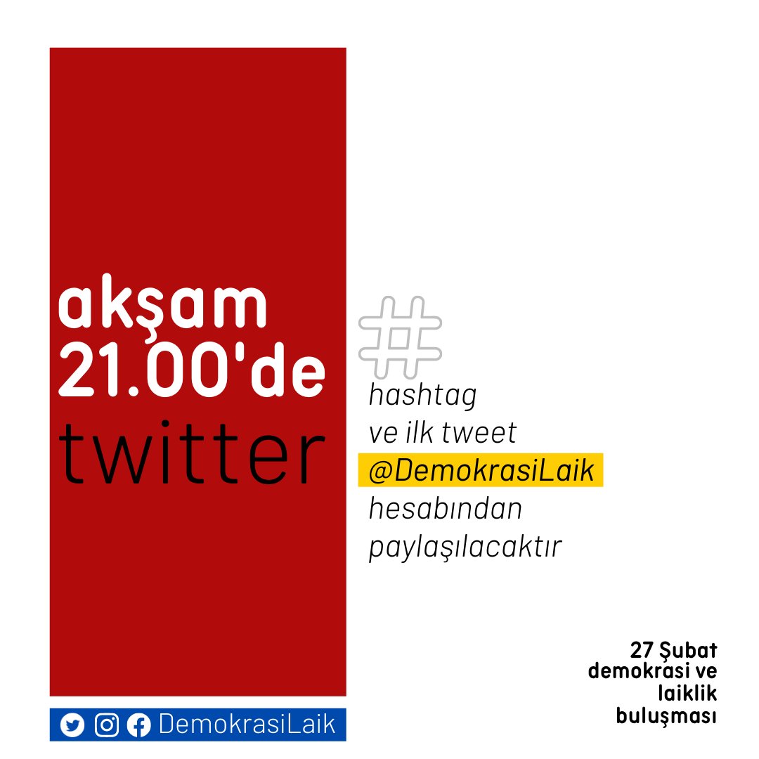 ‘Demokrasi ve Laiklik Buluşması’ Twitter hesabından yapılan duyuruda, etkinliğe dair saat 21.00’de #DemokrasiLaik hashtag ve ilk tweet paylaşımının yapılacağı belirtildi.