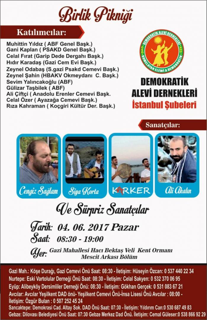 Demoratik Alevi Derneği İstanbul’daki tüm şubeleriyle 4 Haziran Pazar günü Gazi Mahallesi Hacı Bektaş Veli Kent Ormanı’nın da bir araya geliyor. Birlik pikniğine, Alevi Bektaşi Federasyonu Başkanı Muhittin Yıldız, Pir Sultan Abdal Kültür Derneği Başkanı Gani Kaplan, Garip Dede Dergahı Başkanı Celal Fırat, Gazi Cemevi Başkanı Hıdır Karataş, Sultangazi Cemevi Başkanı Zeynel Odabaş, HBVAKV Okmeydanı Başkanı Zeynel Şahin, Koçgiri Kültür Derneği Başkanı Rıza Eroğlu, Yalıncak Sultan Alevi Kültür Derneği Sevim Yalıncakoğlu ve PSAKD Yöneticisi Gülizar Taşbilek gibi birçok Alevi Kurum temsilcisi katılacak. Piknikte, Cengiz Sağlam, Siya Korta, Karker ve Ali Akalın’ın yanı sıra sürpriz sanatçılar da katılacak.