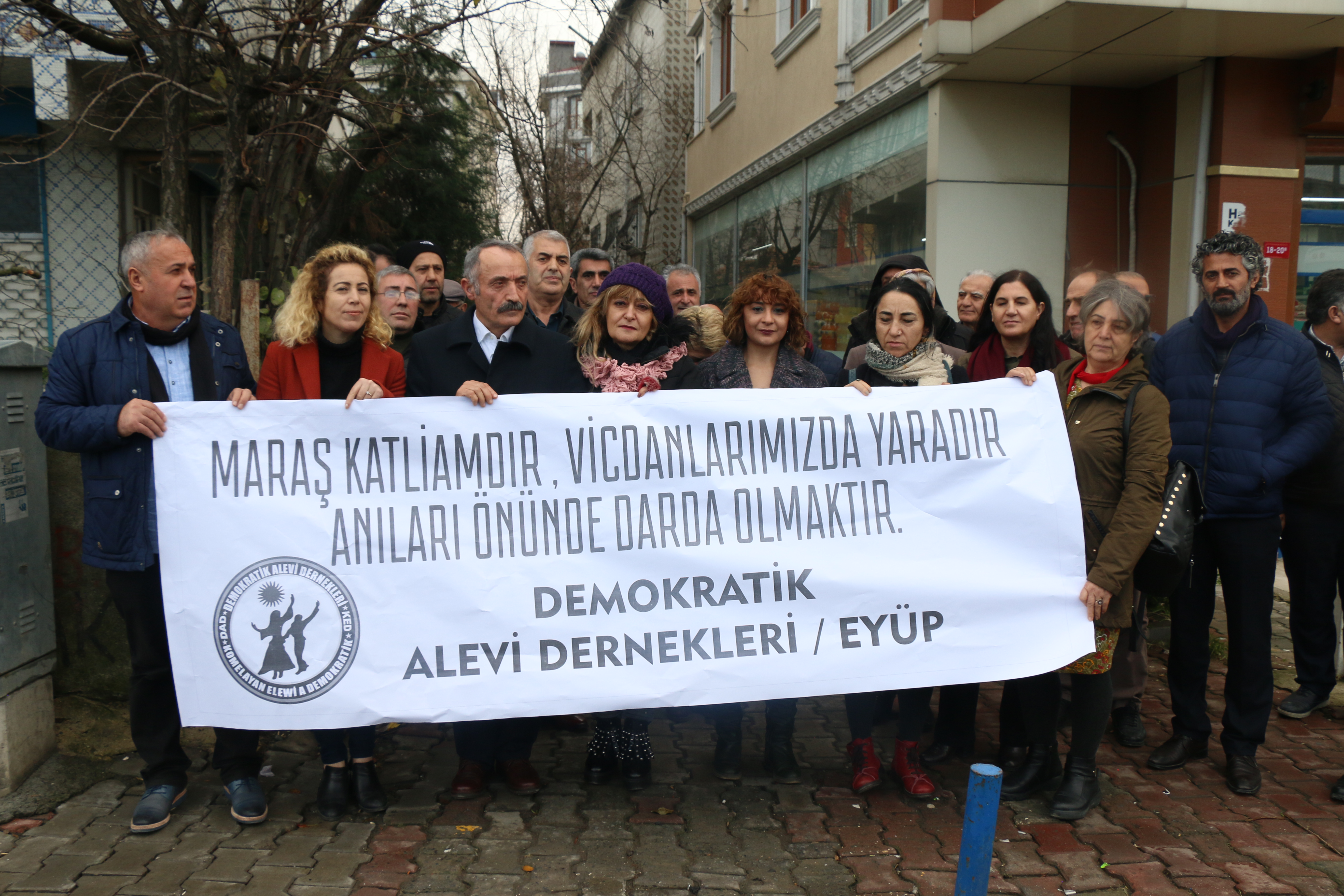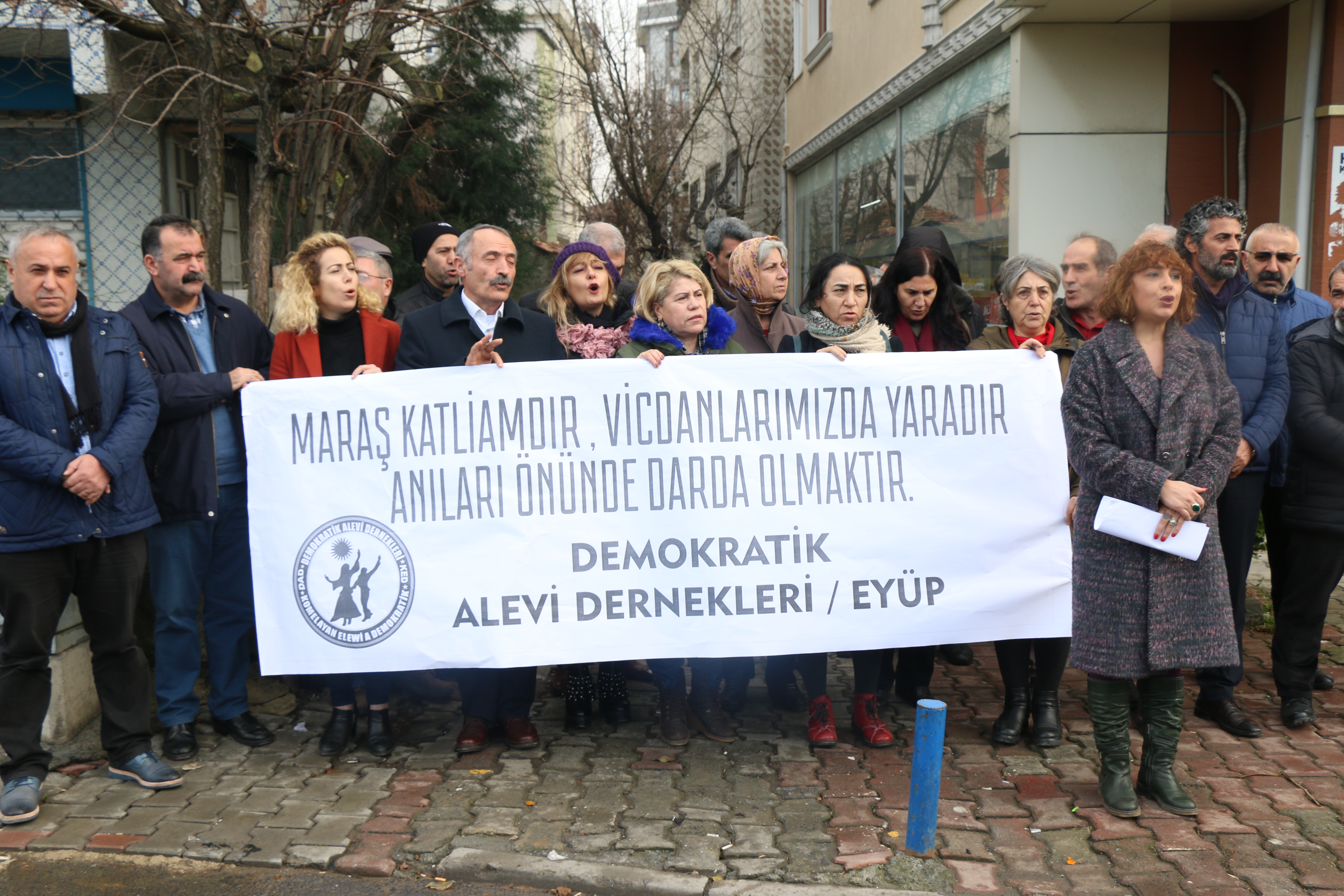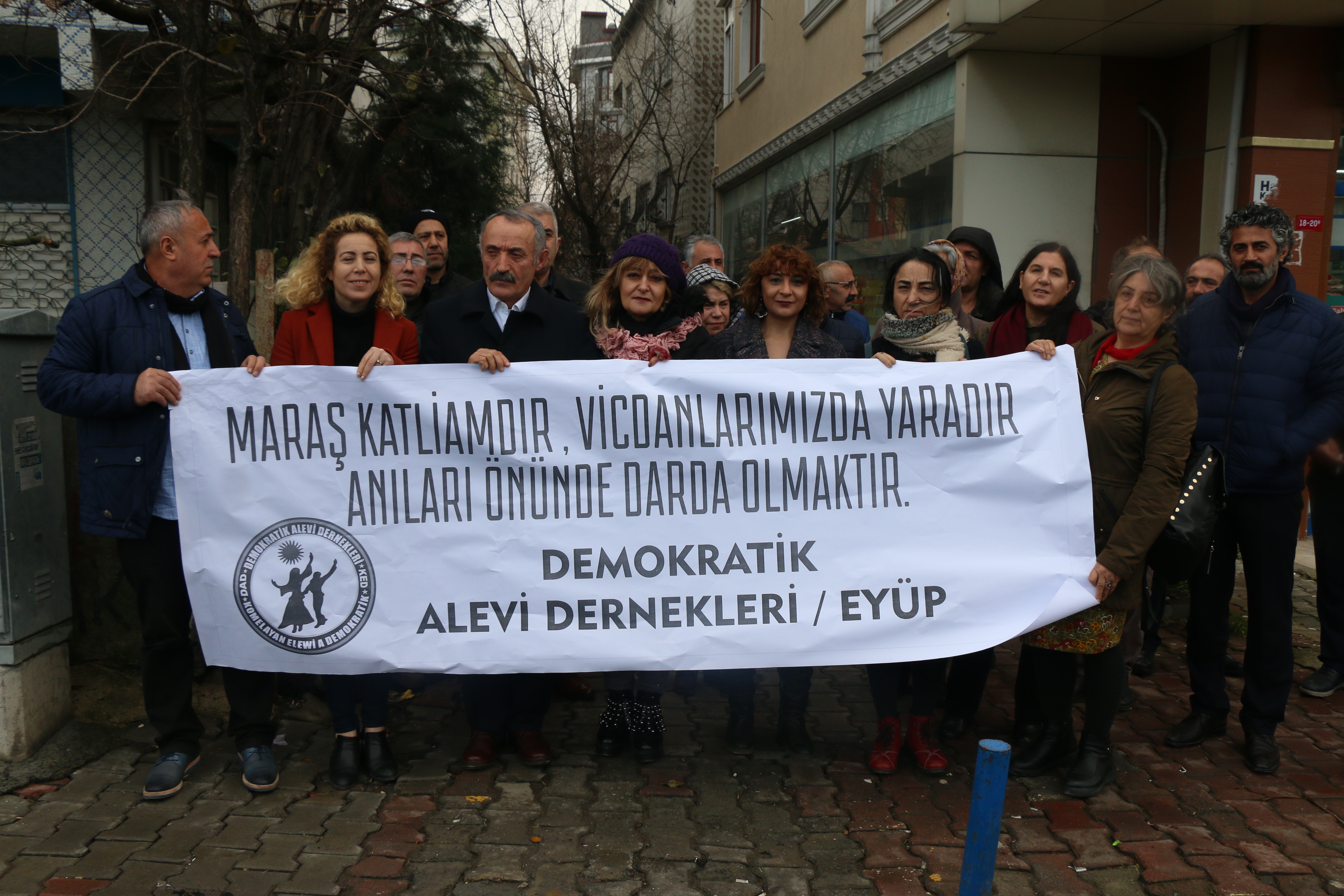 Etkinliğin ardından dernek binasının önünde basın açıklaması yapıldı. “Maraş katliamdır. Vicdanlarımızda yaradır. Anıları önünde darda olmaktır” yazılı pankartın taşındığı açıklamayı Demokratik Alevi Dernekleri Eyüp Şube Eş Başkanı Nergiz Güzel yaptı.